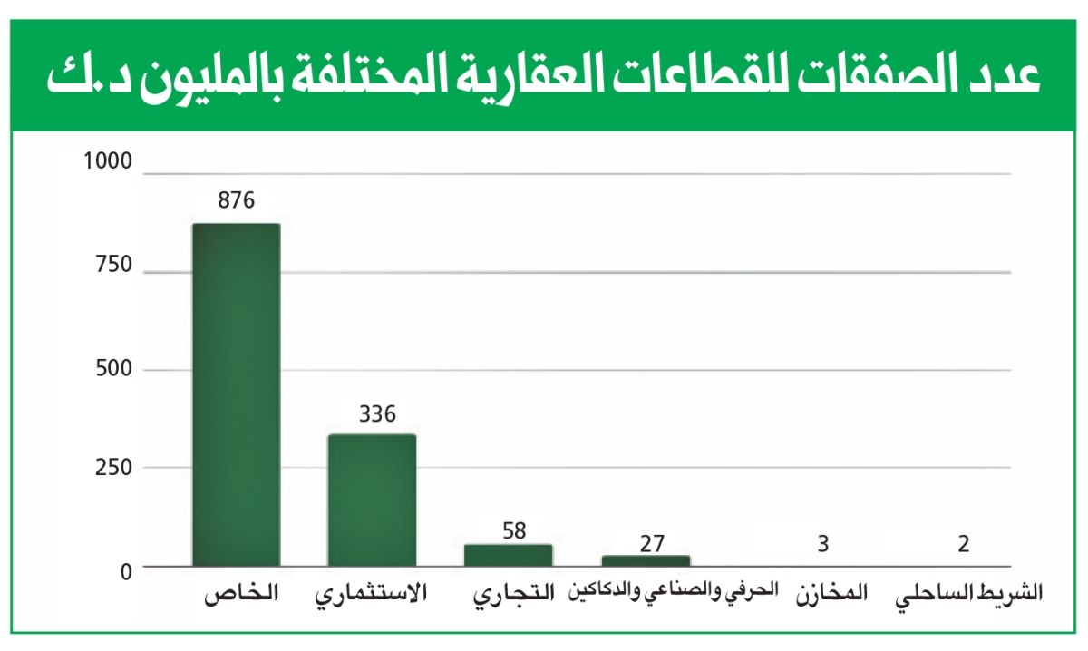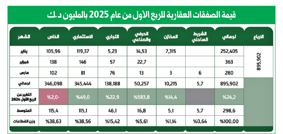 وأضاف التقرير: «ارتفعت القيمة الإجمالية لتداولات السوق العقاري بنسبة 24.2%، لتبلغ 895 مليون دينار، مقارنة بـ721 مليوناً خلال الربع الأول من العام الماضي، كما شهد عدد الصفقات العقارية ارتفاعاً بنسبة 20.98%، مسجلاً 1302 صفقة، مقابل 1077 صفقة خلال ذات الفترة من عام 2024، ما يعكس تحسناً ملحوظاً في حجم النشاط داخل السوق العقاري الكويتي».