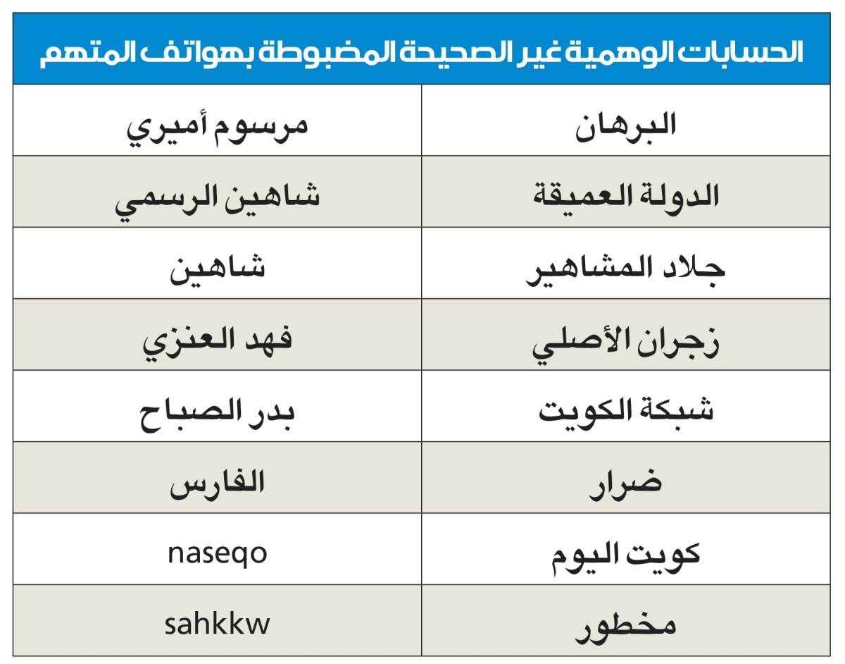 في ضربة محكمة تقض مضاجع أصحاب الحسابات الوهمية المسيئة للبلاد ومواطنيها، تمكنت وزارة الداخلية من ضبط مواطن يدعى «س. ع. ف»، بعد معلومات سرية وردت إليها عن تورطه في إدارة 16 حساباً وهمياً يحمل أسماء غير حقيقية على شبكات التواصل الاجتماعي، واستخدامه لها في بث الإشاعات والإساءة لكرامة العديد من المواطنين مقابل مبالغ مالية.