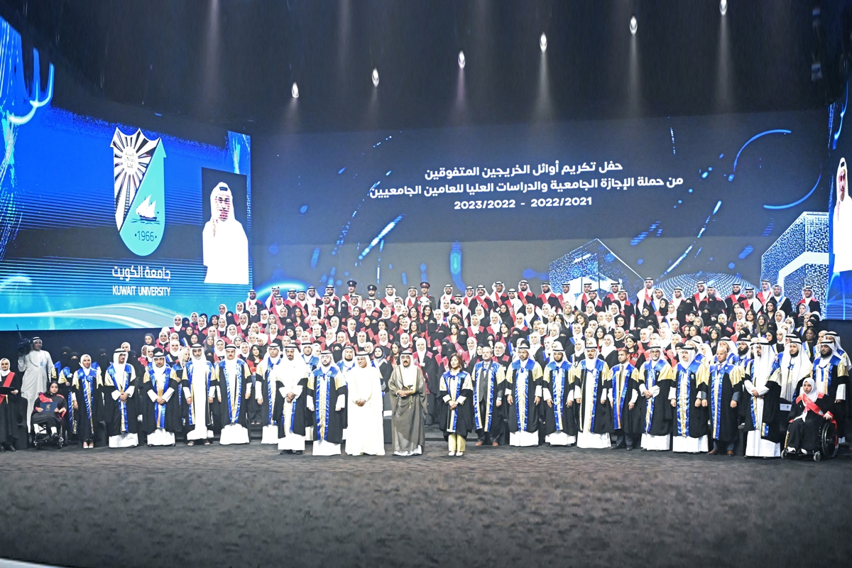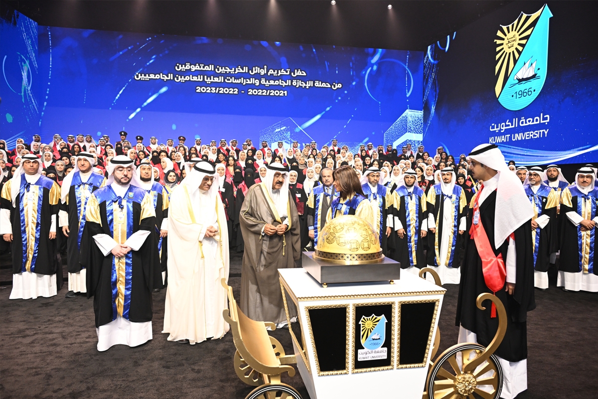 تحت رعاية وحضور سمو أمير البلاد الشيخ مشعل الأحمد، أقيم صباح أمس حفل تكريم أوائل الخريجين المتفوقين من حملة الإجازة الجامعية والدراسات العليا للعامين الجامعيين 2021/2022 و2022/2023 في جامعة الكويت، على مسرح الدانة بمدينة صباح السالم الجامعية.