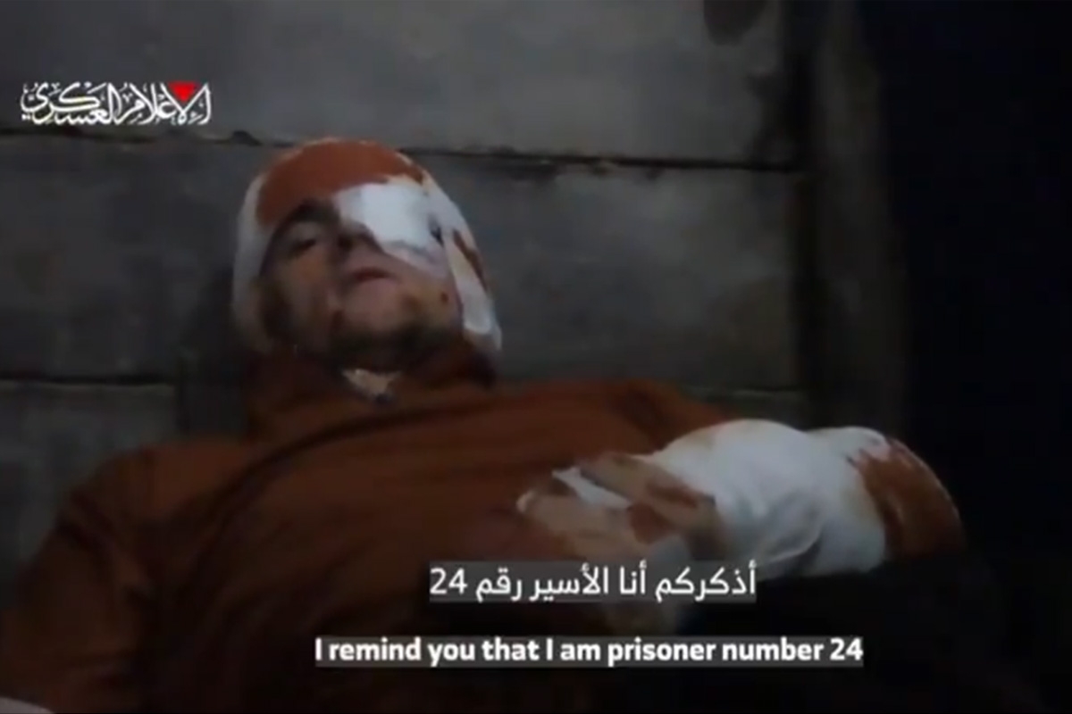 وفي هذا المقطع المصور الذي تتجاوز مدته أربع دقائق، يظهر رجل ممدد وقد لف رأسه وذراعه اليسرى بضمادات مع بقع بنية عليها. ويتحدث الرجل بالعبرية قائلا إنه «السجين الرقم 24»، ملمحاً الى أنه أصيب في قصف إسرائيلي.