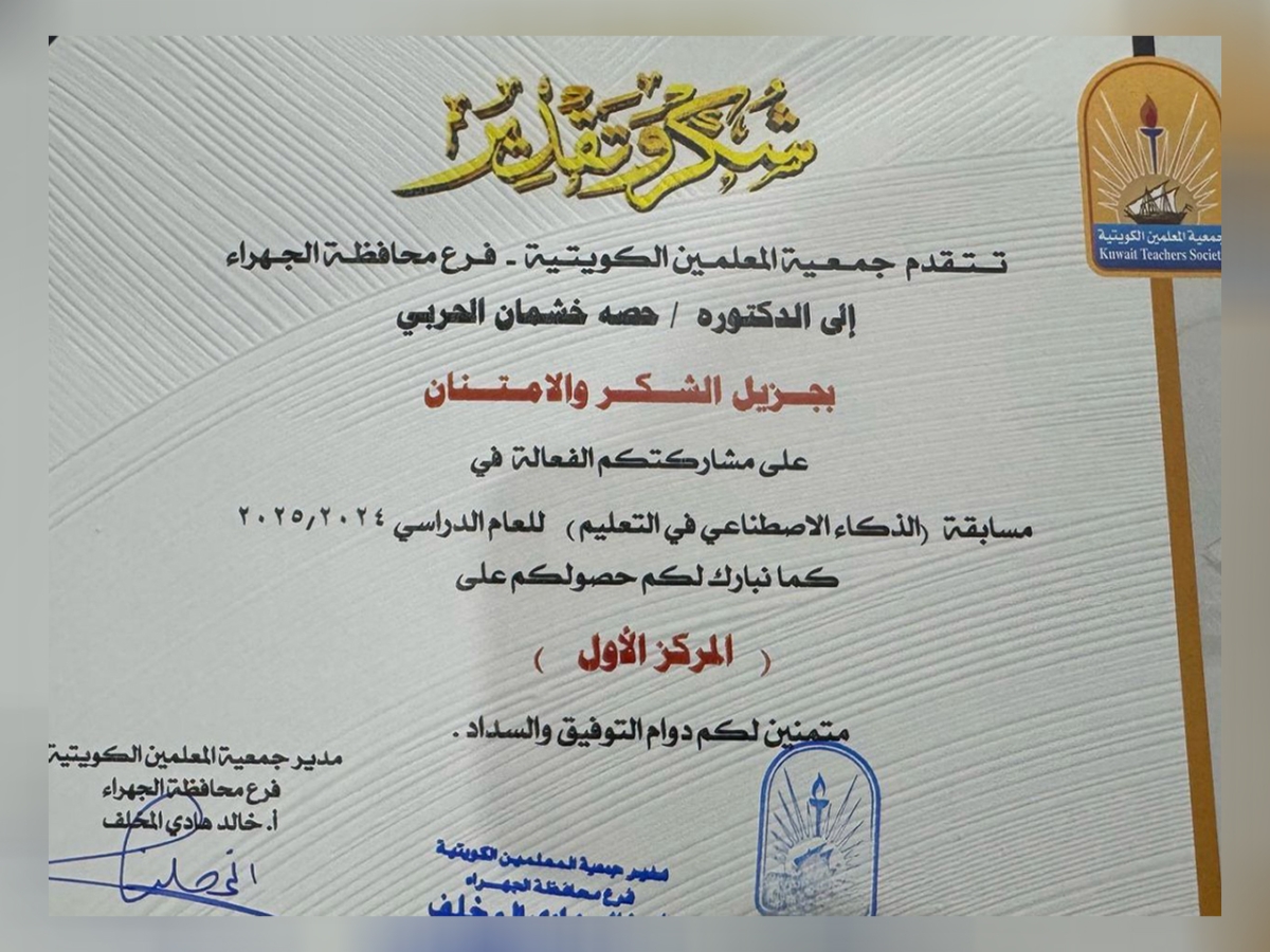 أقامت جمعية المعلمين الكويتية «فرع الجهراء»، حفل تتويج للفائزين بمسابقة الذكاء الاصطناعي في التعليم «استخدام أحد تطبيقات الذكاء الاصطناعي في العملية التعليمية».