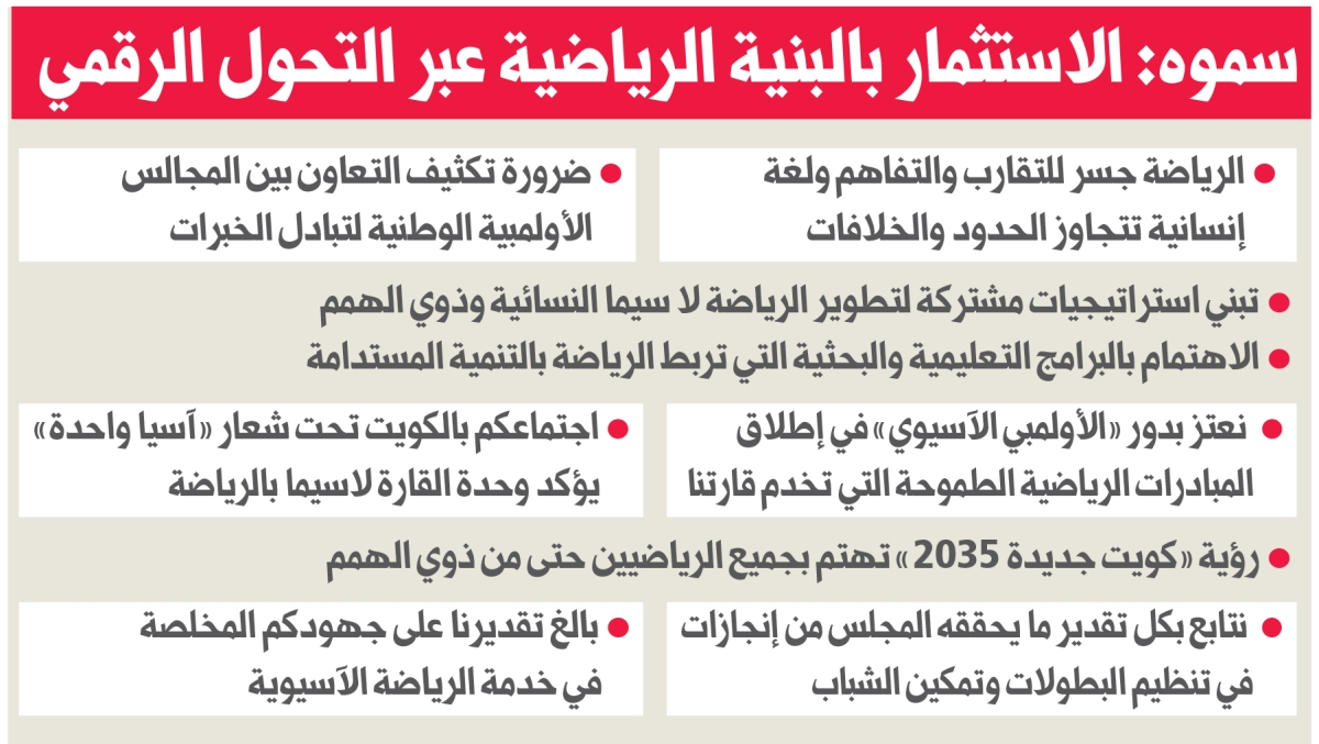 لقد ساهمت القرارات التي اتخذها سموكم بشكل كبير في خلق أو إعادة خلق هذه الوحدة في آسيا، وفي آسيا والعالم، لإبقاء مقر المجلس الأولمبي الآسيوي هنا في الكويت، وإتاحة الفرصة لعقد هذا الاجتماع في الكويت.