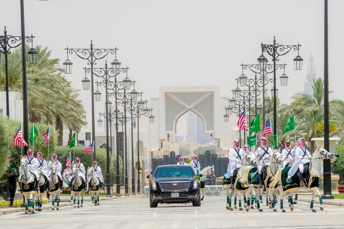 وفي يومه الأول من جولته الخليجية، التي تستغرق أربعة أيام، دخل ترامب قصر اليمامة الفخم في سيارة رئاسية سوداء، يرافقها فرسان يحملون أعلام البلدين على الخيول، وأُطلقت 21 طلقة مدفعية ترحيباً.