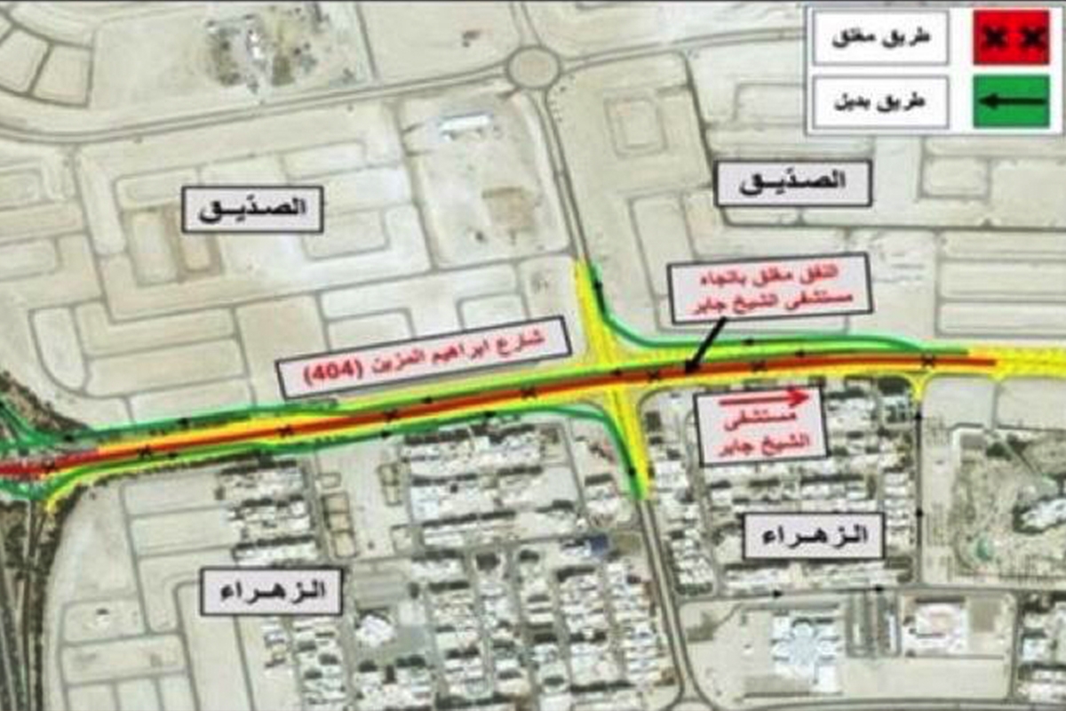 ويبدأ الإغلاق فجر غدا السبت 17 مايو 2025، في تمام الساعة 12:00 بعد منتصف الليل، ويستمر لمدة 8 ساعات، وذلك لتنفيذ أعمال فرش الأسفلت على شارع إبراهيم المزين (شارع 404) في الجزء الواقع بين منطقتي الصديق والزهراء.