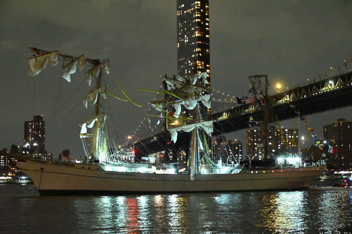 وأظهرت مقاطع مصورة على الإنترنت السفينة وهي تبحر أسفل الجسر الذي يربط بين حي بروكلين وحي مانهاتن في مدينة نيويورك، بينما كانت الصواري تصطدم به.