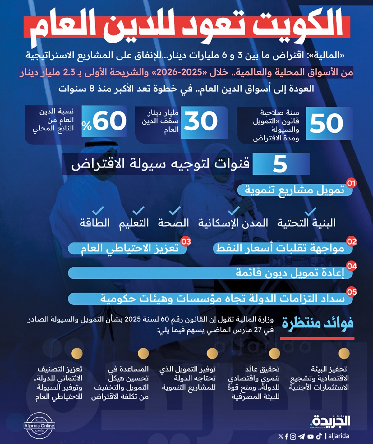 وبيّن أن القانون الجديد يمثّل «إحدى أهم الخطوات الإصلاحية في تاريخ المالية العامة لدولة الكويت»، مشيراً إلى أنه يمنح الحكومة أدوات تمويلية مرنة، ويضع إطاراً قانونياً هو الأكبر من نوعه لإدارة الدين العام، بآجال استحقاق تمتد حتى 50 عاماً، وسقف اقتراض يصل إلى 30 مليار دينار.