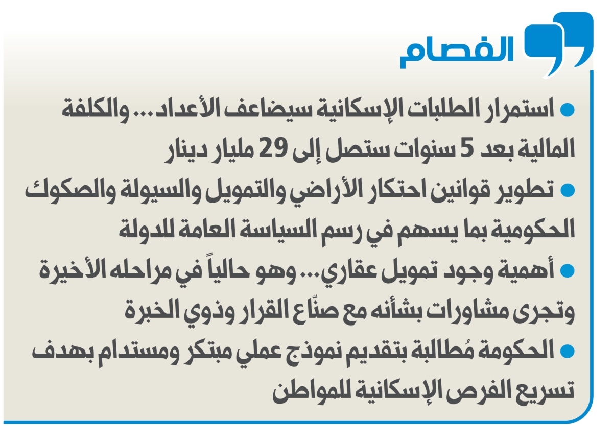 • الفصام: «التمويل العقاري» بمراحله النهائية... و29 مليار دينار كلفة «طلبات 2030»