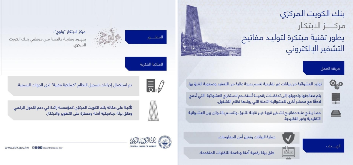 رغبةً من بنك الكويت المركزي في تعزيز الابتكار، والدور الحيوي الذي يقوم به مركز الابتكار «وُلوج» في تحفيز الابتكار بمجالات الذكاء الاصطناعي، والتحول الرقمي وأمن المعلومات، وتكنولوجيا الخدمات المالية والتكنولوجيا الإشرافية والتنظيمية من خلال تقديم بيئة تفاعلية لتطوير واختبار المنتجات والخدمات المبتكرة، صرح محافظ البنك، باسل الهارون، بقيام البنك، من خلال مركز الابتكار «وُلوج» بتطوير تقنية مبتكرة لتوليد مفاتيح التشفير الإلكتروني، والتي تمثّل نقلة نوعية في مجال حماية البيانات وتعزيز أمن المعلومات.