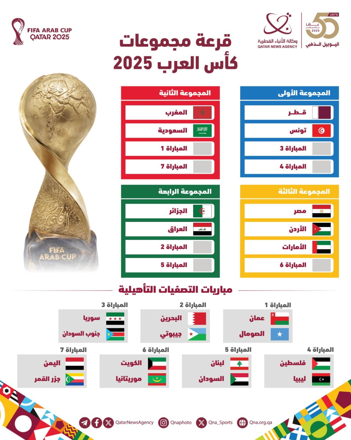 وكانت مراسم قرعة كأس العرب قد أجريت في العاصمة القطرية الدوحة، بحضور ممثلين عن الاتحاد الدولي لكرة القدم في مقدمتهم السويسري جياني إنفانتينو، إلى جانب بعض رؤساء الاتحادات الأهلية للمنتخبات المشاركة، ومن بينهم رئيس الاتحاد الكويتي الشيخ أحمد اليوسف، وأسفرت القرعة عن وقوع منتخب الكويت في المجموعة الثالثة إلى جانب منتخبات مصر والأردن والإمارات، وذلك في حال تخطيه مواجهة المنتخب الموريتاني في الدور التمهيدي، المقررة أحد يومي 25 أو 26 نوفمبر المقبل في الدوحة.