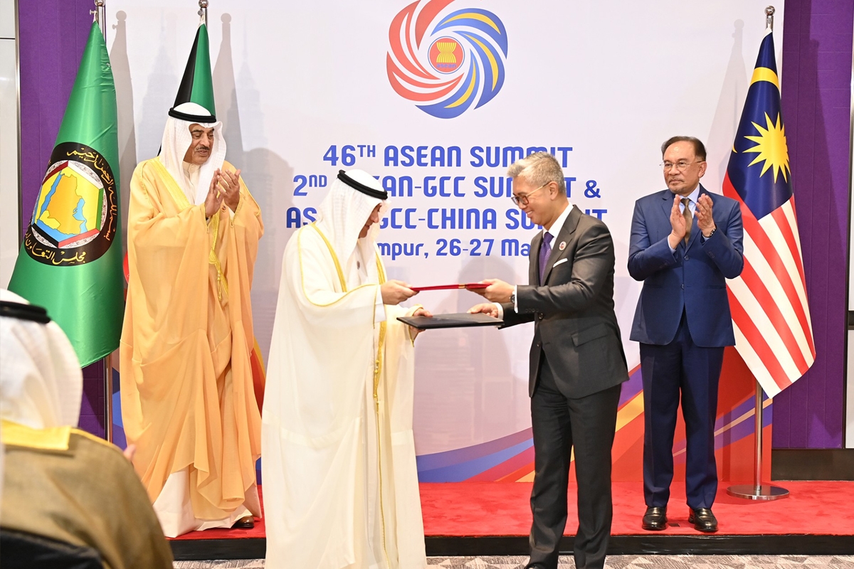 بحضور ورعاية ممثل سمو أمير البلاد الشيخ مشعل الأحمد، سمو ولي العهد الشيخ صباح الخالد، (دولة الرئاسة للمجلس الأعلى الخليجي)، ورئيس وزراء ماليزيا أنور ابراهيم، تم أمس التوقيع على البيان المشترك لإطلاق مفاوضات اتفاقية تجارة حرة بين مجلس التعاون لدول الخليج العربية وماليزيا من قبل الأمين العام لمجلس التعاون جاسم البديوي ووزير الاستثمار والتجارة والصناعة الماليزي، زافرول عبدالعزيز، على هامش القمة الخليجية مع رابطة «الآسيان»، أمس، في العاصمة الماليزية كوالالمبور.