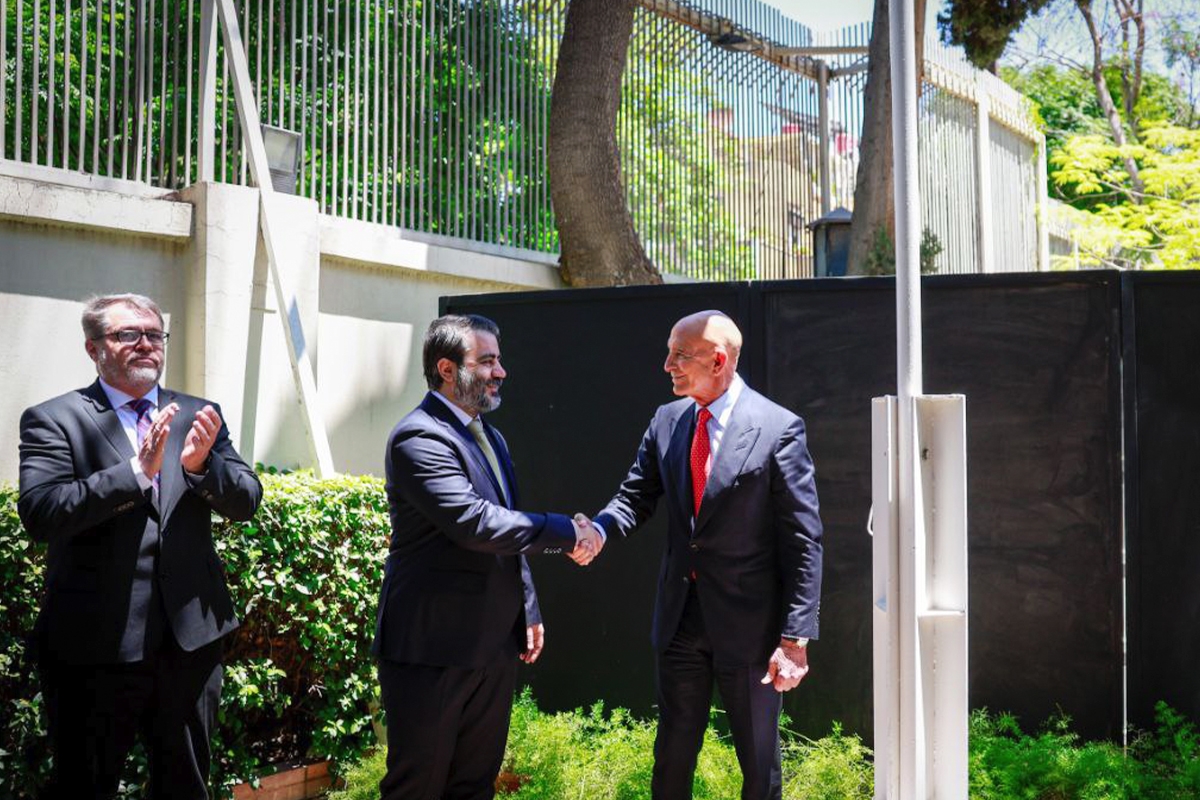 وأفادت وكالة سانا بأن وزير الخارجية السوري أسعد الشيباني، رافق باراك في افتتاح دار السكن الخاصة بالسفير الأميركي في دمشق، بينما التقطت عدسات مصوري «فرانس برس» العلم الأميركي مرفوعاً داخل حرم المنزل، القريب من السفارة الأميركية في منطقة أبو رمانة، وسط إجراءات أمنية مشددة.
