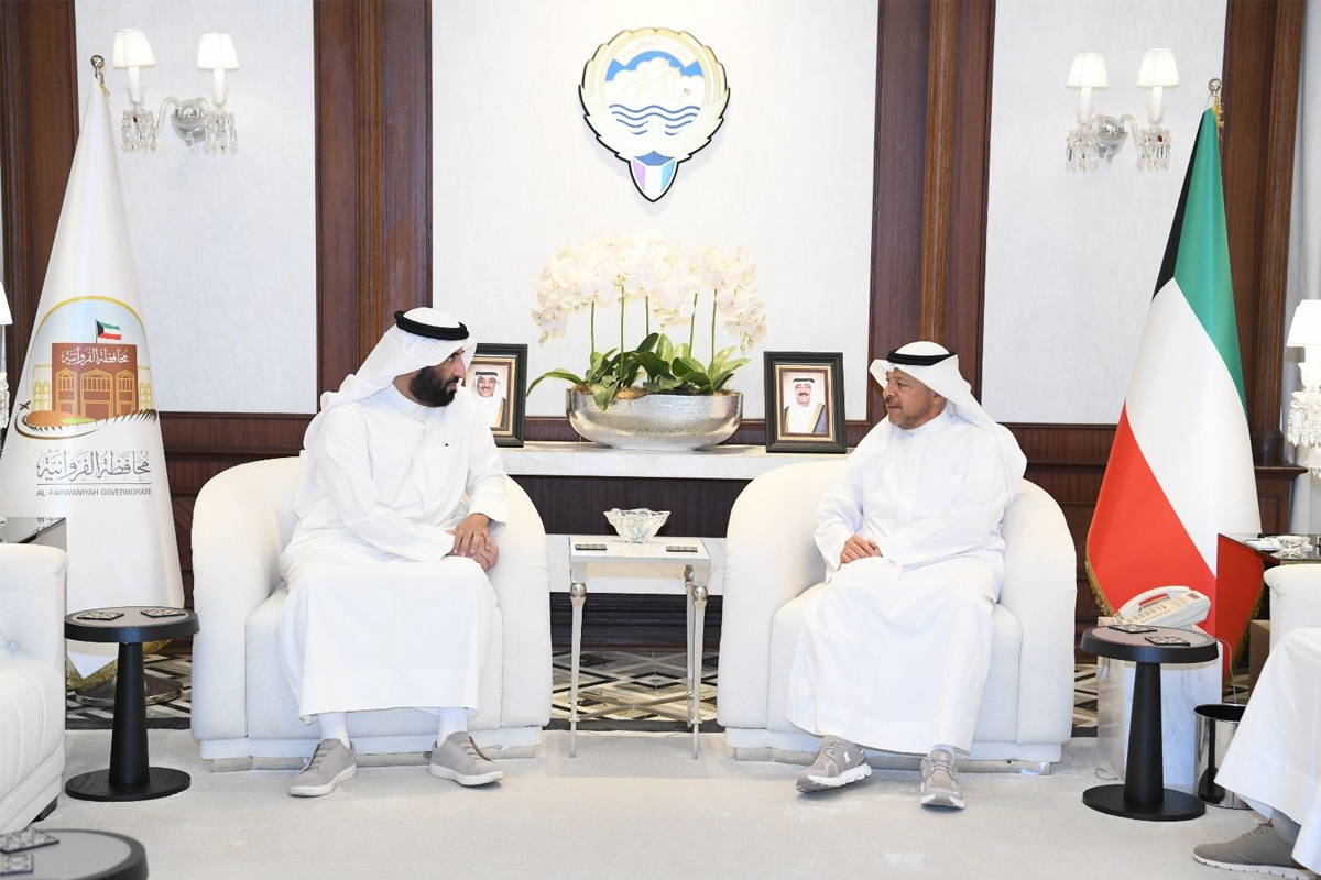 استقبل محافظ الفروانية الشيخ عذبي الناصر، اليوم، في مكتبه، المدير العام للهيئة العامة للطرق والنقل البري بالتكليف المهندس خالد العتيبي، في إطار تعزيز التعاون المشترك، وجرى خلال اللقاء استعراض أبرز المشاريع المتعلقة بتطوير الطرق في محافظة الفروانية، وبحث آخر التطورات، كما تمت مناقشة خطط الهيئة في تطوير الطرق العامة خلال المرحلة المقبلة.