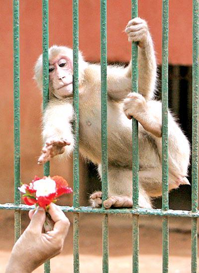 رجل يقدم وردة لأنثى قرد في مناسبة عيد ميلادها الثاني في الهند (أ ب)