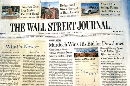 تمكن عملاق صناعة الإعلام الأسترالي روبرت مردوخ صاحب شركة «نيوز كوربوريشين» العالمية، من إبرام صفقة شراء مجموعة «داو جونز» وبالتالي إحكام سيطرته على إحدى أهم الصحف في الولايات المتحدة الأميركية وهي الـ «وول ستريت جورنال».