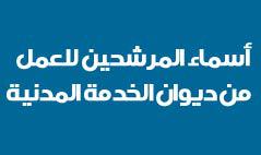 و من جانب آخر طالب السيد / راتب العريفان - مدير ادارة خدمة المواطن و العلاقات العامة المرشحين في الدفعة الحالية (اليوم) مراجعة جهة العمل التي رشحوا لها مباشرة ً (دون الضرورة لمراجعة ديوان الخدمة المدنية ) وذلك إعتباراً من يوم ( الأربعاء ) الموافق ( 26/12/2007م ) مصطحبين معهم المستندات التالية : 1. صورة عن البطاقة المدنية. 2. صورة عن الجنسية . 3. صورة عن شهادة الميلاد 4. صورة عن الشهادة الدراسية. 5. عدد ( 4 ) صور شخصية . ونوه العريفان بأن المرشحين من أصحاب الحالات الخاصة ( ذوى الإحتياجات الخاصة ، أبناء الشهداء ، أبناء الأسرى والمفقودين ) عليهم مراجعة إدارة خدمة المواطن والعلاقات العامة لإستلام كتب ترشيحهم ومن ثم مراجعة الجهات المرشحين لها مباشرة لإستكمال إجراءات التعيين .::::::::::::::::::::الأمانة العامة للأوقاففاطمه محمود على بوفرسنحمد محمد جاسم الفوزانمحمد حمد فهد العجمىعهود عيد سعود الثوينىساره على محمد غلومخلود فواز عايض الدوسرىبشاير خالد منير المطيرىنوره عبد العزيز منصور المنصوردلال عبيد ناصر الرشيدينوال هذال سعد المطيرىخلود غلاب بركات المطيرىاقبال عوض حمود الخالدىموسى عبد الصمد غلوم ندوماسماء فهد فهد الناصر العتيق:::::::::::::::::::: الأمانة العامة للمجلس الأعلى للتخطيط والتنميةمزنه احمد بدر الشبلىمحمد تويم شلوان الهاجرىعايد عيد عفاس الشمرىفالح حمود ماضى الهاجرىايمان خالد جهز العتيبىريم بدر خالد العازمى العنود خضير سالم العازمىهدى سليمان عبد العزيز الجار اللهحصه حمد على الشويبشروق سحيم معطش المطيريعيده خلف فهد العنزىمشارى عيد مجبل الهيلعمنيره حمدان محمد العميرىحنان ناصر فهد المطوعسلطان عامر سلطان المطيرىغدير شكرى محمود . العنزىهديل يوسف عبد الرحمن المزينىنوره مساعد محمد الخنينىاحمد حبيب حسن الرسهدى عيسى جريان اجبليموضى محمد عبد اللطيف العلىعائشه محمد عبد الله محمدمريم فوءاد حبيب الخياط:::::::::::::::::::: الإدارة العامة للإطفاءشريفه على سعيد الحسينعذارى مبارك مضحى زيديوسف عيد عايض العتيبيايمان مرضى صقر العنزىهدى على جمعه علىظبيه منيف عبد الهادى راشدكفايه عدنان حاكم محمدعبير عدنان حاكم محمدانوار مجرش طشه الرشيدىشهد لافى محمد المطيرىافراح فهيد رجعان الضفيرىبشرى عدنان محمد الحكيمضيحه عبيد بركه المطيريعلى ابراهيم عيسى القطانخزنه خالد هرماس العازمىعذاري مبارك عبد الله المرتجي العازميهيا راشد هليل الميمونىاحمد سالم سعود العازمىحصه عبد الله سعد فالحفاطمه مناحى فلاح الدوسرىنوره متعب على المطيرىمنيره هادى رميس الدوسريفاطمه نايل مصارع العنزىمريم عبد الرحمن محمد المطيرىابتسام راشد ضايف راضىعبد الله جبيع هادي مسعود العجميفايز ضيدان سعد العتيبىطلال فريهيد فالح العدوانىفاطمه محمد عبد الهادى المحميدعبد العزيز محمد سعود المفرحمنصور مسلم بداح المطيرىاحمد محمد على المرادتهانى عوض مثقال المطيريخالد حسين عبد الله المسباحسحر احمد على اكبر بستكىابرار عبد الله احمد العوض:::::::::::::::::::: الإدارة العامة للجماركمحمد ناصر مشعاب المطيريمريم عيد مطلق المطيرىاسماء حسين ابراهيم حمادريم احمد عبد الله العلىفاطمه حميد مختار الصرافافنان محمد ابراهيم الخليفىحنان خالد عبد الله الوزانبشائر حمد خليفه الشلاشمنال على محمد الدريهمشيماء مبارك جاسم الصليبىريم فايز فهد العنزىعبير دهيمان خالد الشمرىفاديه احمد حمد السنانزمزم فلاح عبد الرحيم رشيدساره فهاد محمد فهادمنال مناور عبدالله الرشيدى منى سعد عايش زبنابتسام مسير صالح المطيرىمشاعل نايف عايش العازمىعلياء بخيت سليمان الرشيدىفاطمه جواد حسن القطانهند صالح محمد الضيفنوف احمد زيد الزاملعذارى ذياب حمود التوحيدامل شعيب مبارك العلىوضحه عبد الرحمن مانع المانعنوير حمد عماش العازمىمريم وليد على صالحفجر مصطفى عبد الحميد الصالحمحمد طاهر ابراهيم طاهرفاطمه عبد الوهاب حافظ مسيعيدجنان محمد خالد الدويلهبدور باسم عبد الله الكهيلىساره عيد سعود الث