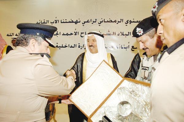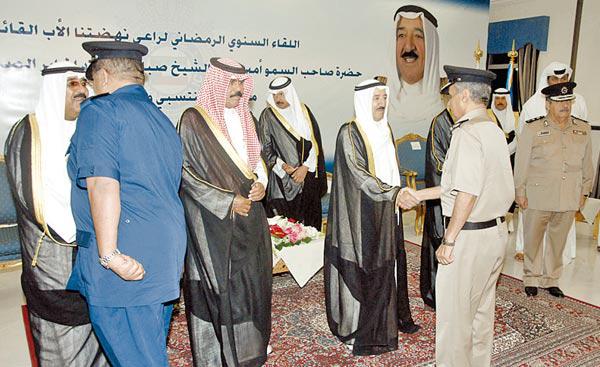 شدد سمو أمير البلاد الشيخ صباح الاحمد على أهمية الدور المنوط بمنتسبي رجال الداخلية في خدمة الوطن، مؤكدا انهم حراس الوطن القادرون على حمل المسؤولية الكبيرة الملقاة على عاتقهم والمتمثلة في حفظ الامن.جاء ذلك عقب زيارة سمو الأمير لوزارة الداخلية بمناسبة الغبقة الرمضانية المقامة على شرف سموه في نادي ضباط الشرطة الليلة قبل الماضية، يرافقه سمو ولي العهد الشيخ نواف الاحمد ونائب رئيس الحرس الوطني الشيخ مشعل الاحمد. فيما كان باستقبالهم النائب الاول لرئيس مجلس الوزراء وزير الداخلية والدفاع الشيخ جابر المبارك ووكيل وزارة الداخلية الفريق ناصر العثمان وكبار القيادات في الوزارة.وألقى سمو الأمير كلمة في رجال الداخلية قال فيها: «سعدت الحقيقة بعدما سمعت كلمة أفرحتني وهي التعاون والتنسيق والتكامل من رجال أمن الشرطة مع إخوانهم في الجيش والحرس الوطني، ويجب أن يكون الهدف هو التعاون لاستقرار بلدكم وأمنه». وأضاف سموه: «أنتم (الشرطة) حراس الوطن وهم (الجيش) حماة الوطن وعليكم مسؤولية أن يكون البلد آمنا».وأوصى سموه رجال الامن بتطبيق النظام على كل الفئات، وقال: «طبقوا النظام على كل كبير وصغير كان من يكون وسأحميكم بنفسي»، لافتا الى أهمية ألّا يألو رجال الداخلية جهدا بتطبيق القانون على الجميع من دون استثناء حتى يرتدع كل من يفكر ان يعبث بالبلد او يخل بقوانينها، وأكد الأمير أن التضحيات الخالدة التي قام بها منتسبو وزارة الداخلية في سبيل حفظ امن الوطن هي موضع فخر وتقدير من قبل الدولة وكافة أبناء الوطن. واختتم سموه كلمته بقوله: « لا أريد أن أكون خطيبا عليكم، أحييكم وأحيي قدرة أخي وزير الداخلية بتحمل ثلاث مهام على عاتقه، جزاه الله خيرا وأرجو أن تكونوا ساعده الايمن وتعينوه، وكل سنة وأنتم بخير».من جهته، أكد وكيل وزارة الداخلية الفريق ناصر العثمان، في كلمته التي ألقاها بالمناسبة، أن «تحقيق الامن والامان للوطن والمواطنين سيظل دائما هدف المؤسسة الامنية باعتباره اهم حاجات الانسان بكل ما تعنيه من سكينة وضمان للحاضر والثقة في المستقبل... ففي ظل الأمن يبدع الفرد ويزدهر المجتمع حيث ينطلق الكل للعطاء والبناء».واوضح الفريق العثمان أن «زيارة سمو الأمير البلاد وسمو ولي العهد ونائب رئيس الحرس الوطني ورئيس جهاز الامن الوطني ومرافقهيم ولاء يزيد رسوخا في وجدان أبناء قيادات الشرطة على اختلاف رتبها ومراتبها»وأضاف أن «الامن بالنسبة لوزارة الداخلية ليس قضية آنية بل سيظل دائما المحور المركزي لاهتمام القيادة الامنية وعلى رأسها النائب الاول لرئيس مجلس الوزراء وزير الداخلية والدفاع الشيخ جابر المبارك الذي يقود المنظمومة الامنية لتبلغ أقصى استعداداتها ولتصل الى أعلى درجات جاهزيتها لحماية المجتمع ومكتسباته ولتكون خطط واجراءات وتدابير هذه المنظومة قاعدة اساسية لانطلاق تحقيق طموحات سموكم في أن تتبوأ الكويت المكانة اللائقة بها بين الامم المتقدمة وأن تعود درة للخليج العربي كما كانت».وقال الفريق العثمان: «يا صاحب السمو... ان قيادات وزارة الداخلية تعي تماما اننا في منطقة تعيش اليوم ظروفا امنية وسياسية واجتماعية بالغة الحساسية وتمر بمرحلة دقيقة من مراحل تاريخها، وهذه الحقيقة تستوجب علينا الاعداد والاستعداد لسد كل ثغرة نتوقع ان ينجم عنها ما يعرّض امننا ووحدتنا للخلل والخطر ومن ذلك المنطلق وبتعاون مؤسسات المجتمع وتضافر افراده تستعد قوة الشرطة لتكون بإذن الله تعالى سدا منيعا لكل ما يهدد امن الوطن الغالي من اي جهة كانت، ونشيد بهذه المناسبة باخواننا قيادات الجيش والحرس الوطني على وجه الخصوص ومؤسسات المجتمع ذات العلاقة على وجه العموم على حسن التنسيق والتعاون الجاد والفعال في بناء الاستراتيجية الامنية الشاملة لحماية الامن الداخلي حيث سيكون للجيش والحرس الوطني وسائر المؤسسات الاخرى دور وواجبات ومهام فيها مع التنويه ان هناك اجتماعات متواصلة بين تلك الجهات تحت مظلة القيادة التنسيقية للمنطقة الخلفية لوض