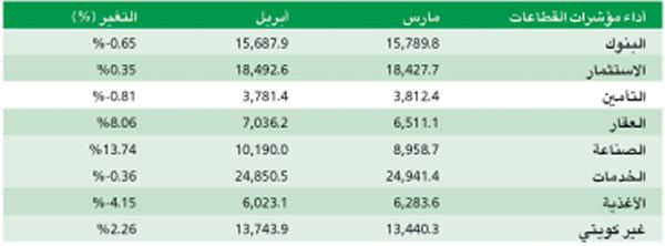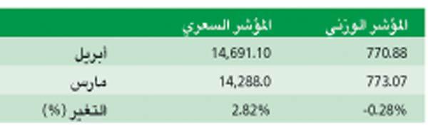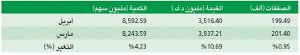 مؤشرات السوق1) المؤشرات الرئيسيةشهد شهر أبريل حالة من التباين في أداء مؤشري السوق الرئيسيين، اللذين تأثرا بالعوامل المحيطة بالسوق، والتي أدت إلى حالة من التركيز على الأسهم الصغيرة في حين تراجعت التداولات على الأسهم القيادية، وكنتيجة لذلك كان نشاط المؤشر السعري أفضل من نشاط المؤشر الوزني، فرغم البداية القوية لكلا المؤشرين في بداية تداولات الشهر، بدأت بوادر تراجع المؤشر الوزني مبكراً يوم 7 أبريل، إذ عجز عن ملاحقة معدل نمو المؤشر السعري. وبداية من يوم 13 أبريل واصل المؤشر السعري نموه وإن بوتيرة أهدأ، بينما بدأ المؤشر الوزني يتراجع ويفقد مكاسبه المحققة في بداية الشهر في دلالة واضحة على فقدانه للقوة الدافعة.وكان السوق على موعد مع حركة تصحيحية في نهاية الشهر أفقدت المؤشر السعري جانباً كبيراً من مكاسبه الشهرية من دون أن تتمكن من دفع المؤشر دون إغلاق مارس، قبل أن يتمكن من الارتداد بقوة في أيام التداول الأخيرة، فيما تراجع المؤشر الوزني مسجلاً خسائر على المستوى الشهري تمكن من التعافي منها عبر حركة ارتفاع أخيرة مكّنته من العودة تقريباً إلى مستوى إغلاق مارس. وأنهى المؤشر تداولات الشهر عند 770.88 نقطة بتراجع مقداره 2.19 نقطة ونسبته 0.28% من إقفاله في مارس.2) مؤشرات القطاعاتسجلت قطاعات سوق الكويت للأوراق المالية تبايناً في أدائها خلال شهر أبريل إذ انقسمت مناصفة بين رابح وخاسر. وترأس مجموعة القطاعات المرتفعة قطاع الصناعة الذي ارتفع مؤشره بنسبة 13.74% منهياً تداولات الشهر عند مستوى 10,190 نقاط تلاه كل من قطاعي العقار وغير الكويتي بنمو نسبته 8.06% و2.26% على التوالي. في حين سجل قطاع الاستثمار أقل نمو حين أغلق مؤشره عند 18,492.6 نقطة بنمو نسبته 0.35%، أما القطاعات الخاسرة فقد تصدرها قطاع الأغذية ثم التأمين والبنوك.حركة التداول1) إجمالي السوقتباين أداء مؤشرات التداول للسوق في أبريل، إذ ارتفعت كمية الأسهم المتداولة في السوق عن شهر مارس بنسبة بلغت 4.23% لتصل إلى 8.59 مليارات سهم، بينما انخفضت قيمة الأسهم المتداولة خلال الشهر بنسبة 10.69% لتصل إلى 3.52 مليارات د.ك. كما وتراجع عدد الصفقات المنفذة خلال الشهر، حيث شهد أبريل تنفيذ 199,498 صفقة بانخفاض نسبته 0.95% عن شهر مارس الماضي. 2) القطاعات استأثر قطاع الاستثمار بالحصة الأكبر من تداولات الشهر من حيث الكمية والقيمة، فقد بلغ عدد الأسهم التي تم تداولها للقطاع 2.89 مليار سهم، شكلت نسبة 33.6% من إجمالي كمية الأسهم المتداولة في السوق خلال أبريل، في حين بلغت قيمة تداولات القطاع نفسه 1.12 مليار د.ك. أي ما نسبته 31.94% من إجمالي قيمة التداول في السوق خلال الشهر. من جهة ثانية، شكلت تداولات قطاع التأمين أقل نسبة من إجمالي السوق خلال الشهر من حيث الكمية والقيمة، إذ تم تداول عدد 6.58 ملايين سهم تشكل نسبة 0.08% من إجمالي الكمية المتداولة في السوق. 3) الشركاتبالنسبة إلى الشركات، احتلت الشركة الوطنية للميادين المركز الأول من حيث كمية الأسهم المتداولة، إذ تم تداول عدد 726.36 مليون سهم من أسهمها، تلتها شركة مجموعة الصفوة في المركز الثاني والتي وصل إجمالي كمية أسهمها المتداولة إلى 687.95 مليون سهم، وجاءت شركة اكتتاب القابضة في المركز الثالث من حيث كمية الأسهم المتداولة بـ493.27 مليون سهم.أما من حيث قيمة التداول، فقد تصدرت شركة مجموعة الصفوة قائمة الأسهم الأكثر تداولاً من حيث القيمة، إذ بلغ إجمالي قيمة أسهمها المتداولة خلال الشهر نحو 158.74 مليون د.ك، تلتها شركة الاتصالات المتنقلة والتي وصلت قيمة تداول أسهمها إلى 155.23 مليون د.ك. خلال الشهر، في حين احتل «بيتك» المركز الثالث من حيث القيمة حيث بلغت قيمة أسهمه المتداولة 140.62 مليون د.ك.تغير أسعار الأسهم خلال الشهربالنسبة إلى قائمة الأسهم المرتفعة خلال الشهر، فقد تصدر القائمة سهم شركة منا القابضة بنسبة نمو بلغت 196%، تلاه سهم شركة الشبكة الآلية للتوزيع بـ74.07%، ثم سهم الشركة الخليجية للصخور بـ 60.00%.أما بالنسبة إلى قائمة الأسهم المتراجعة، فقد تصدرها سهم شركة ايكا