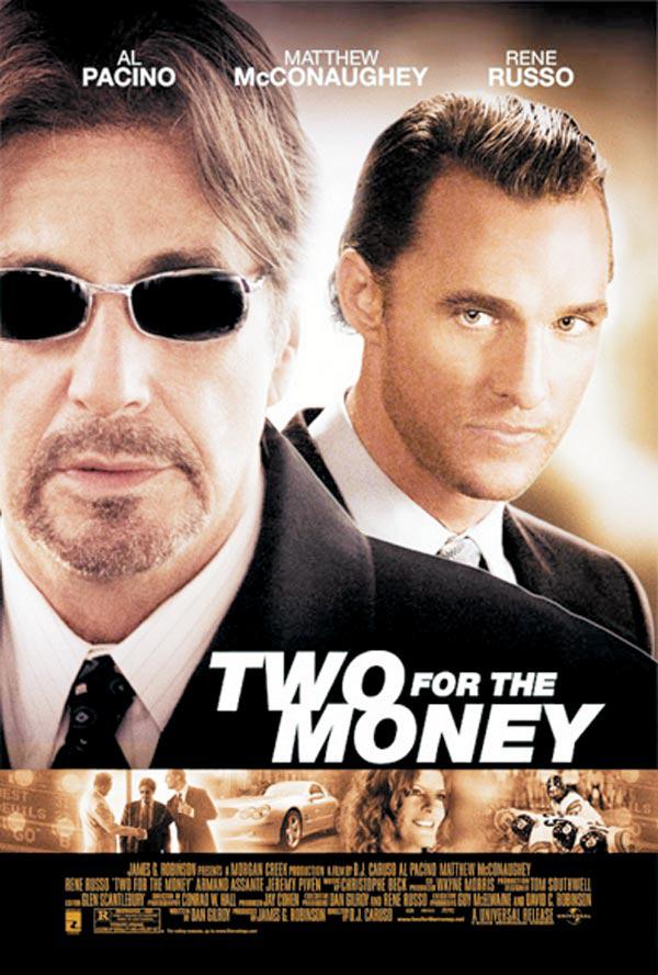 لدى مشاهدة فيلم Two For the Money أحدث أفلام المخرج د.ج كاروزو، تشعر انك شاهدته مرّات كثيرة. لا شكّ أنّ الممثّل المخضرم آل باتشينو هو النجم فيه لكنّ أداءه في هذا الفيلم يشبه أداءه في فيلم Scent of A Woman . إنّه آل باتشينو «المرشد» الذي يحضن شابًّا «مجتهدًا» تحت جناحَيه ويعلّمه أساليبه.