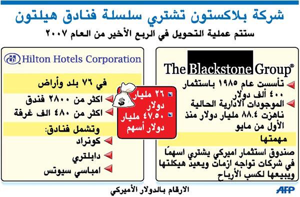 صفقة الهيلتون وفي العودة إلى أبرز تفاصيل صفقة هيلتون، اتفقت مجموعة «بلاكستون» الاميركية الخاصة على شراء سلسلة فنادق «هيلتون كورب» مقابل نحو 26 مليار دولار في أكبر صفقة من نوعها في سسلسة عروض من شركات الاستثمار الخاصة لشراء شركات فنادق. وبموجب شروط الصفقة ستدفع بلاكستون 47.50 دولار لكل سهم في هيلتون وتتحمل ديونه. ويمثل هذا علاوة بنسبة 32% فوق سعر اغلاق الثلاثاء. وقبيل اعلان الصفقة الذي تمّ بعد اغلاق البورصة ارتفعت أسهم هيلتون 6.4% لتغلق على 36.05 دولار في بورصة نيويورك للاوراق المالية. وأكدت «بلاكستون» التي جمعت 4.1 مليار دولار من اصدار عام أولي لاسهمها في اواخر الشهر الماضي إنها تنوي الاستثمار في عقارات هيلتون والاسم التجاري للسلسلة على مستوى العالم. كذلك تشهد صناعة الفنادق طفرة منذ عدة سنوات حيث يتيح الطلب القوي لاصحاب الفنادق رفع الاسعار بصورة مطردة. ومن المتوقع اتمام الصفقة في الربع الاخير من عام 2007. وقالت شركة هيلتون ان مجلس ادارتها وافق على الصفقة امس الأوّل الثلاثاء.(لندن - رويترز)