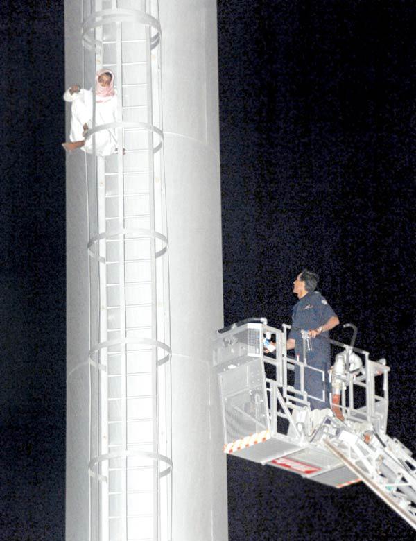 العميد الحربي: يا سعد الشيخ مسافر في مهمة، أنا حاظر بكل اللي تبيه من عيوني يا سعد؟سعد: أنا ما فيه أحد يعطيني فرصة علشان أتكلم الا الشيخ، الشرطة ما فيهم خير، كل ما أكلمهم ياخذوني ويقطوني في النظارة، والاطباء في الكويت ما يعرفون يعالجون، وأنا كنت أصلح سيارة الشيخ جابر، الله يرحمه، في الشويخ...!». هذا ما ورد من حوار مساء أمس الاول، عندما كان مواطن يهدد بالانتحار من أعلى برج في مجمع الافنيوز التجاري، فتمكن مدير أمن الفروانية العميد مزيد الحربي من إقناعه بالعدول، ملبيا له كل مطالبه، التي لا يريد أن يدلي بها الا أمام مدير مباحث الفروانية العميد مازن الجراح، رجال الاطفاء حاولوا مرارا مساعدة المواطن بإنزاله، لكنه أبى الا أن تنفذ كل مطالبه. وبعد أربع ساعات من الاقناع أنزلوه وتمكنوا من ضبطه وإحالته الى التحقيق.وفي التفاصيل «أن مواطنا ظهر في الساعة العاشرة والنصف مساء أمس الأول في أعلى برج في مجمع الافنيوز التجاري، وأخذ ينادي بالناس ويصرخ، فهرعت سلطات الامن المكونة من رجال المباحث والدوريات وأمن الدولة بالتعاون مع رجال الاطفاء وسيارات الاسعاف، وتوجهوا الى موقع البلاغ، وفي حال وصولهم صاح المواطن بهم قائلا «جيبولي الشيخ مازن الجراح، ولا ماراح أنزل...!»، فوجئ رجال الامن بأمره، وطلبوا منه النزول والتفاوض معه فرفض لمدة أربع ساعات».وعندما يئس رجال الامن من مفاوضته أخذ رجال الاطفاء برفع سلم للصعود إليه، وفور وصولهم له الى الاعلى أخذ يصعد هو الاخر أعلى البرج، ويهدد بأنه سيلقي بنفسه إن وصله أحد، نزل الاطفائيون وأخذ رجال الامن ينتظرون ويبحثون عن حل لهذا الموقف غير المألوف، وانقسم الجمهور المتابع الى نصفين، أحدهما يشمت به والآخر يطلبون منه النزول مقابل تلبية كل مطالبه، لكن بعض النساء أخذن يبكين على حاله، غير أنه لم يأبه لما يحدث من حوله».بعد مضي ساعتين من صعوده نزع ثوبه وعلقه على أعلى البرج وطلب من رجال الشرطة ماء ليشرب، فنفذ له طلبه عندما صعد إليه إطفائي وأعطاه الماء، أثناء تعليق المواطن لثوبه سقطت من جيبه زجاجة اتضح أنها خمر، وكان يصرخ على مصوري الصحف ويسبهم قائلا «راح تسوون فيني مثل وحش حولي وطّلعون صوري يا... !» وبعد مضي أربع ساعات بالتمام خضع المواطن للامر الواقع بعد أن أقنعه العميد الحربي بالنزول، وتمكن رجال الاطفاء من إنزاله وتسليمه لرجال الشرطة، فسجلت عليه قضية محاولة انتحار وجار التحقيق.