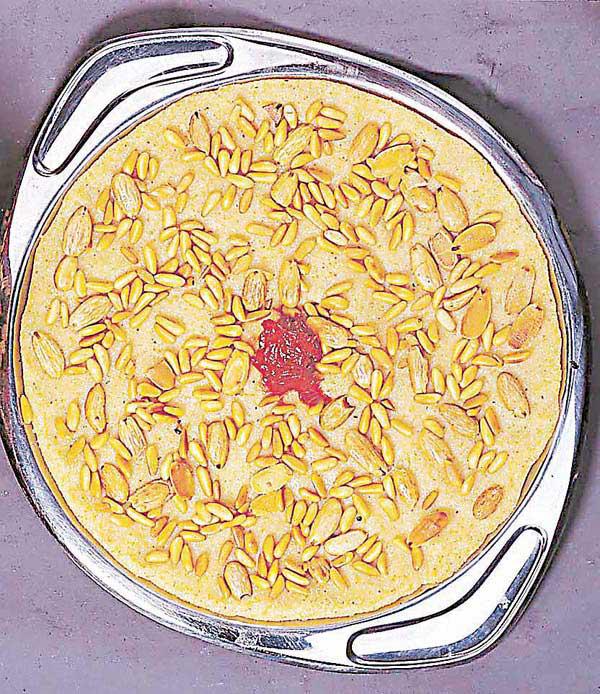 الكمية: 15 شخصاً مدة التحضير: 30 دقيقة مدة الطهي: 60 دقيقة المقادير - 3 أكواب سميد. - 4/3 كوب سمن أو زبدة. - 5 أكواب قطر. - كوب ونصف كوب ماء. - 4/3 كوب ماء زهر. - 4/3 كلغ جبن عكاوي أبيض مفروم ومحلّى. - 4/3 كوب صنوبر محمرّ. 4-/3 كوب لوز مقشر ومحمّر. الطريقة...