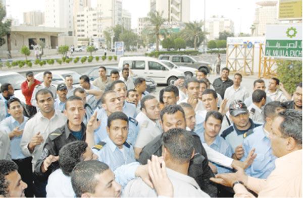 تظاهر أمس عشرات العمال المصريين التابعين لشركة (....) للخدمات الأمنية، أمام مقر شركتهم في منطقة المرقاب، مطالبين بالحصول على معاشاتهم المتأخرة، وقال عدد من المعتصمين لـ«الجريدة» إنهم لم يحصلوا على معاشاتهم لأشهر، وأوضح بعضهم انه حصل على ربع معاشه فقط الذي يبلغ في الشهر 35 دينارا!وقال أحد العمال _رفض الكشف عن هويته_ إن الراتب الشهري للعامل الذي يعمل مدة 8 ساعات هو 35 دينارا و50 دينار لمن يعمل 12 ساعة، في حين يصل الراتب إلى 70 دينارا لمن يعمل مدة 20 ساعة في اليوم.
