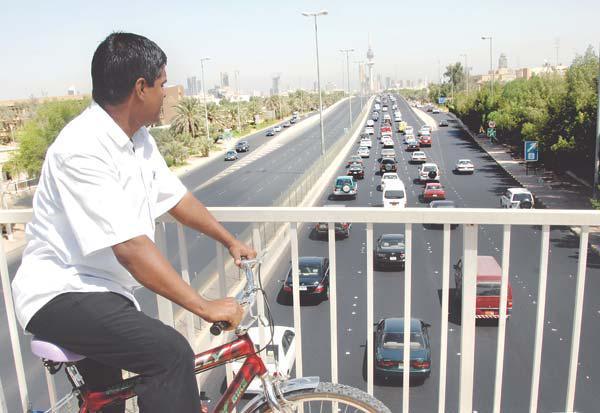 في هذا المنظر الذي أصبح مألوفاً على الكثير من الطرقات في البلاد، لاسيما المؤدية الى الكويت التي تشهد ضغطا مرورياً في أغلب الأحيان، يطل راكب الدراجة (الظاهر في الصورة) ولسان حاله يقول: متى ستحل أزمة المرور في بلاد الخير؟... ومتى ستنتهي مشاريع توسعة الطرقات وانشاء الأنفاق والجسور التي تزيد اثناء انشائها الاختناقات المرورية، لعدم ايجاد طرقات بديلة تستعمل مؤقتا، ريثما يتم الانتهاء من انجازها؟!