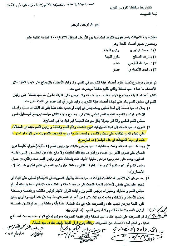 تقدم عدد من اعضاء هيئة التدريس في الهيئة العامة للتعليم التطبيقي والتدريب بشكوى ضد كل من مدير عام الهيئة د. يعقوب الرفاعي وعميد كلية الدراسات التكنولوجية، إلى وزيرة التربية والتعليم العالي نورية الصبيح، تبين تجديد العميد لعضو وافد من أعضاء هيئة التدريس، أوصت لجنة التعيينات بإنهاء عقده أكثر من مرة، وذلك لسوء أخلاقه بعد قيامه بشتم الطلبة الكويتيين ورئيس القسم وزملائه أعضاء هيئة التدريس .«الجريدة» بدورها حصلت من خلال مصادرها على مذكرة التوصيات، التي تدين عضو هيئة التدريس الوافد، وهو دكتور بقسم ميكانيكا القوى والتبريد بكلية الدراسات التكنولوجية، لقيامه بالعديد من التجاوزات، اضافة إلى الشكاوي التي قدمت ضده، فلذلك أرتأت لجنة التعيينات عدم التجديد له، وذلك وفق الأسباب التالية:أولها ان هناك شكوى مقدمة من الطلبة تبين استهزاءه وتكرار شتمه الطلبة الكويتيين اضافة الى إساءته الأدب وإهانته مدرس الكمبيوتر في دورة ICDL في معهد نيوهورايزن في الدورة التي أقامها القسم هناك، وتكرار سلوكه السيئ في أمور عدة حتى أنه يشتم زملاءه أعضاء هيئة التدريس، كذلك رفضه تدريس بعض المقررات بجدوله في الفصل الحالي التي تقع في نطاق تخصصه الدقيق، ولذلك لم يكمل نصابه التدريسي، ودرس فقط 7ساعات لفصلين دراسيين متتاليين، كما تطاول الاستاذ الوافد على رئيس القسم وشتمه في أحد الاجتماعات الرسمية للقسم العلمي، واتهم زملاءه أعضاء القسم بأنهم يقومون بأعمال غير مشروعة، كما انه كثير الاعتراض على الجداول والأعمال الموكلة إليه، ويقوم بتفتيش بريد زملائه والاطلاع على جداولهم، كما اثبتت لجنة التوصيات انه لا يقوم بأي إنتاج علمي، ولا يقوم بالأعمال الموكلة إليه بالشكل المطلوب، وليس له نشاط ثقافي أو أكاديمي داخل القسم، ولايلتزم بأعمال القسم مثل عدم حضوره اجتماعات القسم لثلاثة فصول متتالية . هذا وقد بعث رئيس القسم قرار لجنة التعيينات في قسم ميكانيكا القوى والتبريد إلى عميد الكلية في مايو 2005 ولم يبت فيها العميد حتى تاريخ 30/10/2005.والجدير بالذكر أنه تم انهاء عقده قبل ست سنوات وعاد عن طريق «الواسطة» إلى العمل، كما أصر عميد الكلية على حمايته من خلال سماحه بأخذ إجازة طبيه مدة أسبوعين على غير وجه حق، مدعيا أنه يعاني انزلاقا غضروفيا، ولكنه غادر البلاد متجها الى عائلته في كندا في شهر مارس 2007 الماضي.ومازال عضو هيئة التدريس الوافد على رأس العمل في الكلية ومدرجا في مواد الفصل الصيفي، الامر الذي ادى الى احتجاج هيئة التدريس، فلماذا لم يتخذ عميد الكلية أي أجراء ضده على الرغم من أن جميع الدلائل تدينه وتؤكد تجاوزاته، فأين مدير عام الهيئة د. يعقوب الرفاعي من هذه القضايا، مع العلم أنه تم إخطار المدير العام للهيئة باللقاء المفتوح، الذي نظمه اتحاد الطلبة مؤخرا بديوانية الاتحاد من قبل أمين السر العام للقائمة المستقلة .همس ولمزحين حضر مدير إدارة العلاقات العامة بالهيئة الى ديوانية اتحاد الطلبة وتم التطرق الى الموضوع همس «الشرهان» بأذن مدير عام الهيئة مما يدل على ان الشرهان لديه علم مسبق بالموضوع ومتقاعس في اتخاذ القرار.