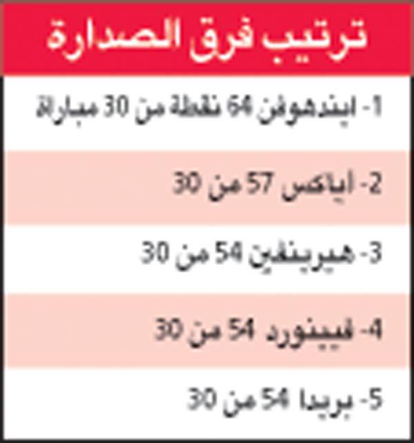 وبقي اياكس ثانيا بعدما تجمد رصيده عند 57 نقطة مقابل 64 لايندهوفن الذي وسع الفارق الى 7 نقاط إثر فوزه على ضيفه غرونينغن 3/صفر أمس الأول السبت.وتراجع فيينورد روتردام الى المركز الرابع بخسارته امام جاره سبارتا روتردام بهدفين لثيو لوسيوس (11) وجيوفاني فان برونكهورست (62) مقابل ثلاثة اهداف للمغربي نور الدين البخاري (15 و50) ومارفين امنيس (90). وتجمد رصيد فيينورد عند 54 نقطة بفارق الاهداف خلف هيرينفين الفائز على رودا كيركراده 4/3 امس الاول السبت.وفاز فيللم تيلبورغ على هيراكليس الميلو بهدفين للسوري جورج موراد (46) وفرانك ديموجه (68) مقابل هدف لروبرت شيلدر (70).وخسر فنلو امام نيميغن بهدف للياباني كيسوكي هوندا (34) مقابل هدفين ليون فان بوكرينغ (79) وباس سيبوم (90).(أ ف ب)