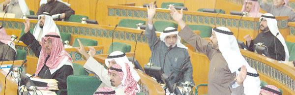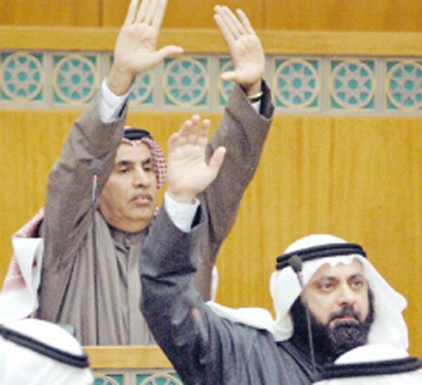 وجاءت «فزعة» الإنجازات البرلمانية بعد أقل من 24 ساعة من جلسة استجواب وزيرة التربية نورية الصبيح التاريخية، فيما يشبه تقديم عربون نيابي للتعاون بين المجلس والحكومة، بما يسمح بتنفيس حالة الاحتقان التي كانت المؤشرات تشير إلى أنها كانت قريبة من «ابغض الحلال» الدستوري المتمثل في حل مجلس الأمة. ورغم تحدي بعض النواب للتهديد بحل المجلس فإن سلوك أغلبهم مال إلى إنجاز القوانين وتمريرها، رغم معارضة بعض نواب كتلة العمل الشعبي لعدد من بنود تلك القوانين. وفي ما يلي تفاصيل الجلسة:افتتح رئيس مجلس الأمة بالإنابة محمد البصيري الجلسة امس في التاسعة صباحا بتلاوة اسماء الحضور والمعتذرين، وطلب النائب صالح الفضالة نقطة نظام تحدث فيها عن رسالة قدمها الى رئيس المجلس بخصوص طلب الافراج عن اربعة من الكويتيين المعتقلين في غوانتانامو، على ان ينقلها إلى الرئيس الاميركي جورج بوش خلال زيارته إلى الكويت.كويتيون في غوانتانامووردّ البصيري بأن من ضمن لقاءات رئيس المجلس جاسم الخرافي مقابلة الرئيس الأميركي، وأنه سيطرح هذا الموضوع معه، مشيرا الى ان الخرافي التقى رئيس اهالي المحتجزين في غوانتانامو خالد العودة وطلب منه تزويده بملف هذا الموضوع وتحديد النقاط المطلوبة.وأكد نائب رئيس مجلس الوزراء وزير الخارجية الشيخ محمد الصباح ان هذه القضية ليست قضية مجلس او حكومة، اذ لا يمكن ان نقبل بأن يتم احتجاز ابنائنا بشكل غير قانوني، موضحا ان الحكومة الكويتية تريد توفير العدالة لابنائها، لذلك فإنها منذ اربع سنوات تتكفل بالمشورة والاجراءات القانونية للتعامل مع احتجازهم في غوانتانامو.وأكد ان هذا الموضوع سيطرح بشكل مباشر خلال زيارة الرئيس الاميركي، موضحا ان الوعد الذي أخذناه من الحكومة الاميركية يقضي بأن يتم التعامل معهم بشكل قانوني وتقديمهم إلى العدالة.واشاد النائب عبدالله عكاش بإجراءات الحكومة الكويتية، متمنيا ان يفرج عن المحتجزين في غوانتانامو.براءة المحتجزينواستغرب النائب حسين الحريتي كلام الحكومة بأن تطلب من الحكومة الاميركية تقديمهم الى المحاكمة، مؤكدا ان القضاء الكويتي قال كلمته واثبت براءة هؤلاء المحتجزين.وانتقل المجلس الى موضوع بند الرسائل، وتحدث النائب وليد الطبطبائي عن تردي الخدمات الصحية في الكويت، موضحا ان هذا لا يعود الى قدم المباني وتهالكها، بل يعود إلى القيادات الفاسدة التي تتولى سدة المسؤولية.«النفسي» بؤرة فسادوذكر الطبطبائي ان الطب النفسي هو بؤرة الفساد، اذ ان ثلث العاملين في الجيش والشرطة لديهم ملفات في المستشفى من اجل الحصول على الاجازات والاعفاء.ودعا الوزير الطويل الى «نفض» القيادات الصحية القديمة لان الفساد في «الصحة» ليس متمثلا في المراكز والخدمات، وإنما في سوء ادارة وفساد القيادات.ورد وزير الصحة عبدالله الطويل بانه طلب من ادارة الشؤون القانونية مراجعة ملف كل موظف تجاوزت خدمته 30 سنة، لانه لا يمكن ان يبقى موظفاً في منصبه الى الابد.الرنين المغناطيسيواعلن الطويل انه اوقف احدى المناقصات الاخيرة، وشكل لجنة تحقيق فيها، للتأكد من سلامة إجراءاتها، مشيرا الى ان وزارة الصحة تعاني نقصا في الاجهزة الطبية، لاسيما أجهزة الرنين المغناطيسي، لكننا حريصون على ان تكون اجراءاتنا سليمة.ورد الطبطبائي بأنه للمرة الاولى يسمع ان الوزير اوقف مناقصة غرف العناية المركزة في الفروانية، واذا كان هذا صحيحا فأنا اشكره عليه، لكن هناك عدم شفافية في طرح المناقصات.وعلق النائب صالح الفضالة على ما ذكره الطبطبائي بأن من يدخل المناقصات هم شيوخ ووزراء ونواب، معتبرا أن هذا الكلام كارثة، وعيب ان يقال مثل هذا الكلام ولا ترد الحكومة.وطالب الفضالة سمو رئيس الوزراء بأن يقف ويرد ويطلب توضيحاً بشأن: «من هو الوزير والشيخ الحرامي حتى يرد عليه، ولا نترك مثل هذه الاتهامات».واتفق الرئيس جاسم الخرافي على ضرورة أن ترد الحكومة على هذا الكلام موضحاً انه اذا كان الموضوع يحتاج الى تحقيق فيجب ان نحقق فيه.الشيخ والوز
