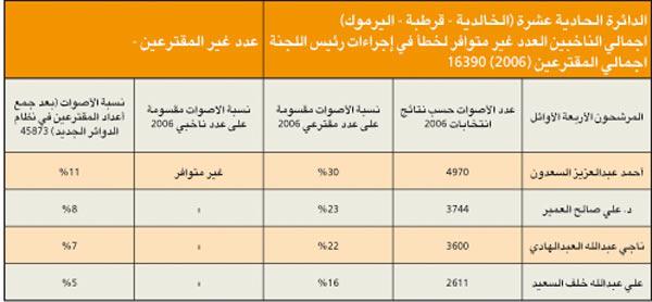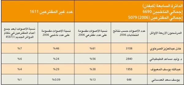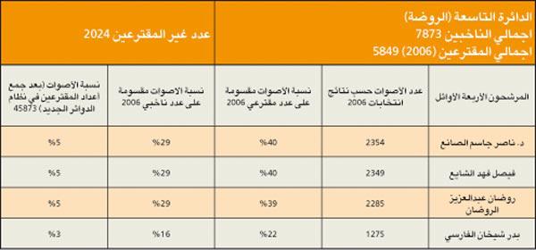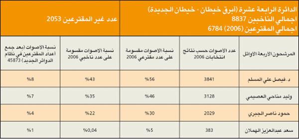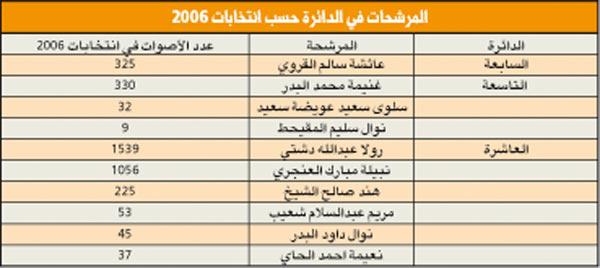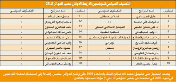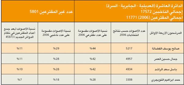 الدائرة الثالثة، دائرة حضرية، فالشريحة الغالبة هي للحضر السنة، حيث يقدر عددهم بأكثر من النصف (نحو 68%) مقابل (14%) للناخبين الشيعة، و(4%) فقط للقبائل. وتتميز بكونها تحتضن الكتل والتنظيمات السياسية الواضحة التوجهات والمعالم، فكل من الحركة السلفية والحركة الدستورية (الاخوان المسلمين)، وقواعد المنبر الديموقراطي، والشخصيات المستقلة المؤثرة (أحمد السعدون كأبرز مثال) تتنافس بقوة على مجتمع الناخبين، وستشهد منافسة قوية وربما شرسة، بسبب الترتيبات التحالفية المتوقعة لعدد من المرشحين المحسوبين على الحكومة، وهي ترتيبات لا يستهان بها.وفي التحليل التالي سوف يتم اعتماد احصاءات ونتائج انتخابات عام 2006 للدوائر الانتخابية التي اصبحت ضمن الدائرة الثانية، وذلك بحسب النظام الجديد للدوائر.مؤشرات عامة 1 - عدد الناخبات يفوق عدد الناخبين بفارق 8222 صوتا نسائيا.2 - تتميز الدائرة بعدد كبير من المرشحين المتعارف على تسميتهم بالمستقلين، وهو مصطلح غير متماسك، ولا يعني معنى واحدا لكل مستقل، ويضاف الى ذلك عدد مؤثر من المرشحين الاسلاميين الذين ستزداد قوتهم في حال اعتماد صيغة التحالفات.3 - المرشحان أحمد السعدون وعادل الصرعاوي سيكونان محورا لحركة الدائرة، فالأول يعتبر شخصية محورية على مستوى العمل السياسي والبرلماني في الكويت، والثاني بسبب أدائه التشريعي والرقابي المهني الذي يغري مرشحين وناخبين غير اسلاميين من التعاطف معه.4 - المرشح الأقوى حسب انتخابات 2006 هو عادل الصرعاوي، حيث حصل على 61% من أصوات المقترعين في دائرته، يليه كل من د. وليد الطبطبائي وفيصل المسلم، حيث حصلا على 56% من اعداد المقترعين في دوائرهم، ويليهم في المرتبه الرابعه المرشح والعضو السابق وليد العصيمي بحصوله على 46% من أصوات مقترعي دائرته.5 - بناء على التركيبة الجديدة للدائرة الأولى من نظام الدوائر الخمس، وباعتبار أن اجمالي المقترعين هو عبارة عن مجموعهم في الدوائر حسب انتخابات 2006، فإن المرشحين الأقوى هما النائبان السابقان أحمد السعدون، وصالح الفضالة(قرر عدم الترشح) بحصولهما على نسبة 11% من الاصوات، ويليهم النائب السابق والمرشح الحالي فيصل المسلم.