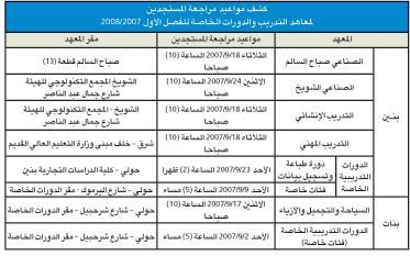 اعتمد مدير عام الهيئة العامة للتعليم التطبيقي والتدريب بالإنابة د. مشعل المشعان نتائج قبول المتقدمين لمعاهد التدريب والدورات التدريبية الخاصة للفصل التدريبي الأول 2007/2008 - ما دون الشهادة الثانوية - وبلغ عدد المقبولين 1641 متدربا ومتدربة.وأفاد نائب المدير العام لشؤون التدريب أ. منصور المشعل بأنه تم قبول 1514 متدربا في المعاهد على النحو التالي: 335 متدربا في المعهد الصناعي - صباح السالم بنسبة لا تقل عن %61، و304 متدربين في معهد التدريب الإنشائي بنسبة %51، أما المعهد الصناعي في الشويخ فتم قبول 359 متدربا بنسبة %57، وتم قبول 176 متدربا في الدورات التدريبية الخاصة (تخصص طباعة وتسجيل بيانات) بنسبة %49، بالإضافة إلى قبول 26 متدربا من فئة الفصول الخاصة بالتعليم العام بوزارة التربية، وفي معهد التدريب المهني تم قبول 206 متدربين، أما الفصل التدريبي الثاني 2007/2008 فتم قبول 108. أما بالنسبة للبنات فقد تم قبول 127 متدربة في المعاهد على النحو التالي: 108 متدربات في معهد السياحة والتجميل والأزياء بعد اجتيازهن اختبارات القبول، و41 متدربة بدورة تنفيذ أزياء، و34 متدربة في دورة تصفيف شعر، 33 متدربة في دورة فن الماكياج، بالإضافة إلى قبول 19متدربة من فئة الفصول الخاصة في التعليم العام بوزارة التربية.وأوضحت مديرة مكتب قبول المتدربين أ. سعاد أحمد الرومي أن نتائج القبول للمتقدمين الى معهد التمريض (بنين، بنات) ستعلن لاحقا بعد استكمال اختبارات القبول، وذلك يوم الأحد 9 سبتمبر في الفترة الصباحية بمقر المعهد بالشويخ، حيث من المتوقع قبول 75متدربا و100 متدربة.ودعت الرومي جميع المقبولين الى مراجعة المعاهد حسب المواعيد المعلنة، مصطحبين معهم صورة من البطاقة المدنية و4 صور شخصية، مشيرة الى انه سيعقد لقاء تنويري للمستجدين لإلقاء الضوء على نظم ولوائح الدراسة والتقويم المتبعة في معاهد التدريب والإجراءات المتعلقة بهذا الشأن. وبينت أنه سيتم توزيع استمارات الفحص الطبي والصحيفة الجنائية على المقبولين لاستكمال إجراءات القبول المطلوبة، علما بأن قبول المتدرب لا يعتمد نهائيا إلا بعد استيفائه اللياقة الصحية والصحيفة الجنائية، متمنية لجميع المقبولين التوفيق والنجاح.
