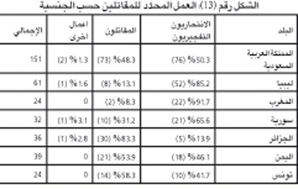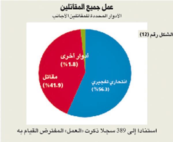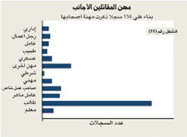 وانتقلت الدراسة بعدها إلى تفحص بعد آخر تبدى في المستندات، وهو الفئة العمرية للمقاتلين الأجانب، حيث لاحظت أن أغلبهم كان في سن الشباب، بينما لفتت إلى أن متوسط أعمارهم يتراوح بين 22 و23 عاماً، في حين أن أصغر مقاتل قد جاء من الطائف كان في الخامسة عشرة من عمره عند دخوله العراق، ويبرهن صغر سن المقاتلين الأجانب في العراق على أن معظمهم جاء متطوعاً ولأول مرة، ولا يندرج ضمن فئة المحاربين المخضرمين، وتتوصل الدراسة إلى أن تحريض جيل جديد من الجهاديين للانضمام إلى ساحة الحرب في العراق يمثل أحد أبرز التحديات المثيرة لقلق السياسيين والمحللين مع استمرار المعارك في العراق. أما الحلقة الرابعة من هذه الدراسة فهي تستعرض جوانب أخرى جرى استقاؤها من «سجلات سنجار»، لتشير إلى جملة مواصفات اتسم بها المقاتلون القادمون إلى العراق، سواء من حيث المهنة، أو طبيعة عملهم، وتصنيفهم داخل الخلايا الإرهابية نفسها بين انتحاري تفجيري، أو مقاتل، أو غيرها من التوصيفات التي وردت في وثائق حملت شعارات «دولة العراق الإسلامية»، وتنظيم «شورى المجاهدين»، وغيرها من التنظيمات ذات الصلة بـ«القاعدة». كما تتطرق الحلقة الرابعة إلى مسارات وتواريخ دخول المقاتلين إلى الأراضي العراقية عبر الحدود السورية بصفة خاصة، من خلال عدد من الإحصاءات والرسوم البيانية التي اعتمدت في بياناتها على «سجلات سنجار».المهنةلم يُشر معظم المقاتلين في «سجلات سنجار» إلى مهنتهم، لكن 157 من أصل 606 فعلوا ذلك، ومن بين مَن سجلوا مهنتهم الأصلية، كان 42.6% (67) طالباً، بينما تفاوتت البقية على نحو واسع، تم تسجيل خمسة معلمين، بالإضافة إلى ثلاثة أطباء، وأربعة مهندسين. وتفاوتت الردود الباقية على نحو واسع، من ردود مفيدة (عسكري: 5) إلى غريبة (معالج بالتدليك: 1).العملذكر معظم المقاتلين الذين دخلوا العراق «عملهم» عند الوصول، وهو تصنيف يفرّق بصورة أساسية بين المقاتلين وبين الانتحاريين التفجيريين، يبدو أن هذا التصنيف يعكس الدور الذي كان المقاتلون يأملون الاضطلاع به لدى وصولهم إلى العراق، لكنها قد تشير إلى المهمة المحددة لهم من قبل المسؤولين المحليين، تحول النصوص المترجمة من «سجلات سنجار» الكلمة العربية «استشهادي» بأساليب متنوعة: مثل «شهيد»، و«استشهاد»، و«انتحاري تفجيري»، أما الكلمة نفسها فتعني «الساعي الى الاستشهاد»، قمنا بتصنيف جميع هؤلاء الأفراد باعتبارهم «انتحاريين تفجيريين» في محاولة لتجنب الالتباس، وبرغم أن ايديولوجية «القاعدة» تعتنق مفهوم الاستشهاد خلال سير العمليات العسكرية التقليدية، فقد تمثّل غرض سجلات المنتسبين هذه في تمكين القادة من تخصيص الأفراد بصورة فعالة للقيام بمهام معينة. وفي مثل هذه الظروف، يشير تعبير «الاستشهادي» إلى الأفراد الذين يحتمل تكليفهم بالهجمات الانتحارية.ومن بين المقاتلين البالغ عددهم 389، والذين حددوا «عملهم» في العراق، كان 56.3% (217) سيصبحون انتحاريين تفجيريين، بينما كان مقررا تعيين 41.9% (166) آخرين كمقاتلين تقليديين، ذكر العديد من المستجيبين مهاماً أكثر تخصصاً، بما فيها العمليات الإعلامية (2)، وطبيب (3)، والمهارات القانونية (1). وقد اخترنا دمج بيانات فئتي الانتحاري التفجيري والشهيد.استنتج العديد من المراقبين أن السعوديين ممثلون بصورة مفرطة بين صفوف الانتحاريين التفجيريين العراقيين. وفي هذا السياق، قامت دراسة حديثة بتحليل بيانات 94 انتحارياً تفجيرياً في العراق، وذكرت أن 44 منهم كانوا سعوديين، وسبعة كويتيين، وسبعة أوروبيين، وستة سوريين، بينما جاءت البقية من بلدان متفرقة في الشرق الأوسط وشمال إفريقيا. تدعم «سجلات سنجار» الاستنتاج القائل إن «أغلبية» الانتحاريين التفجيريين الذين دخلوا العراق ما بين أغسطس 2006 وأغسطس 2007 كانت من السعوديين، وعلى أي حال، فهم يُكذّبون الفكرة القائلة إنه بمجرد وصولهم إلى العراق، يصبح المقاتلون الأجانب السعوديون أقرب احتمالاً من رفاقهم من البلدان الأخرى لأن يصبحوا انتحاريين تفجيريين، 