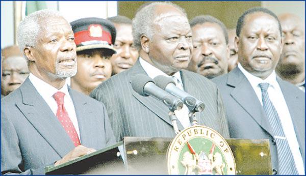 كوفي أنان والرئيس الكيني مواي كيباكي ورئيس المعارضة رايلا أودينفا بعد توقيع اتفاقية تقاسم السلطة بين الحكومة والمعارضة في نيروبي أمس رويترز نشر في 29-02-2008 | 00:00 آخر تحديث 29-02-2008 | 00:00