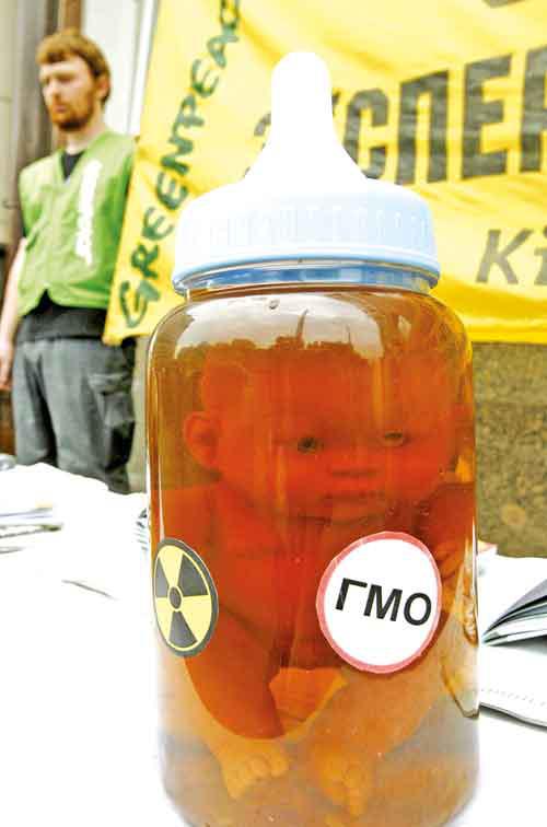 ناشط في منظمة السلام الأخضر يقف بالقرب من مجسم ضخم لزجاجة تحتوي على دمية طفل أمام وزارة الصحة الروسية، احتجاجاً على الابحاث الجنائية والراديولوجية على الأطفال، التظاهرة تأتي ضمن فعاليات اليوم العالمي للطفل.