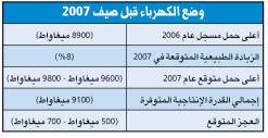 وعن أزمة صيف 2007، ذكر الدوسري أن أعلى حمل مسجل للكهرباء في العام الماضي كان 8900 ميغاواط، بزيادة طبيعية عن العام الذي سبقه تبلغ 8 في المئة نظرا إلى التوسع العمراني وإيصال الخدمات إلى المناطق الجديدة، الأمر الذي جعل أعلى حمل متوقع لعام 2007 يتراوح بين 9600 و 9800 ميغاواط، بينما كانت القدرة الإنتاجية في بداية هذا الصيف تساوي 9100 ميغاواط فقط، ما يعني أن العجز المتوقع يتراوح بين 500 و700 ميغاواط، وهو ما يضع الدولة أمام حتمية القطع المبرمج. إذ كانت التوقعات تتحدث عن أكثر من 45 يوما يمكن أن تستغرقها فترة القطع ولعدة ساعات في اليوم الواحد.