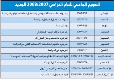عمادة القبول تعلن التقويم الجامعي للعام الدراسي 2007/2008