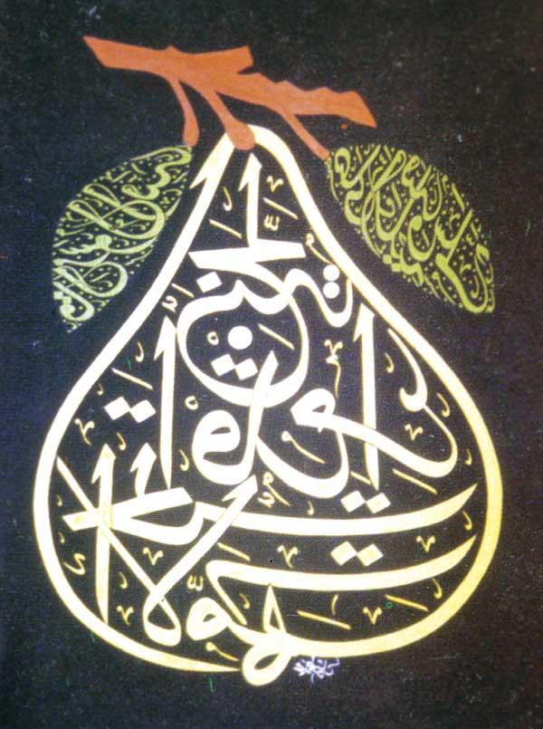 من أعمال فنان الخط العربي محمد رطيل لوحة خطية فنية على شكل كمثرى بألوان الجواش على ورق أسود كانسون (الجنة تحت أقدام الأمهات) بخط الثلث (قال رسول الله) على هيئة ورقة الشجر اليمنى، (صلى الله عليه وسلم) على هيئة الورقة اليسرى, بخط جلي الديواني. وقد عرضت هذه اللوحة من قبل في مكتبة الإسكندرية وفي عدة...