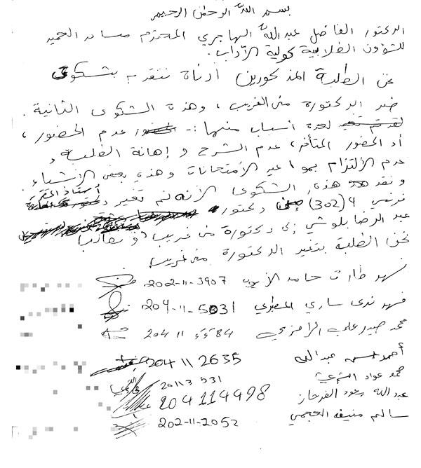 علمت «الجريدة» من مصدر مطلع أن عددا من طلبة كلية الآداب رفع شكوى كتابية إلى العميد المساعد للشؤون الطلابية د. عبدالله الهاجري ضد أستاذة قسم اللغة الفرنسية د. منى الغريب، بعدما رفعوا شكوى سابقة في الفصل الصيفي السابق إلى الشكاوى والتظلمات في العمادة من دون تحقيق أي نتيجة او أن يحصلوا على رد.وتأتي هذة الشكوى ضد الغريب لأسباب عديدة ذكر منها الطلبة عدم الالتزام بالحضور والاختبارات، وإهانة الطلبة بشكل علني داخل الفصول الدراسية دون أي احترام لشخص الطالب أو الطالبة.