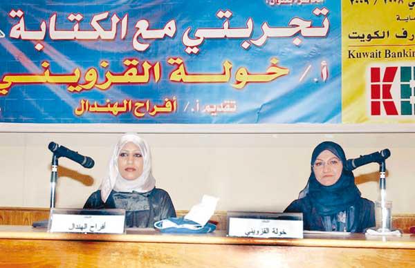 استضافت رابطة الأدباء الكاتبة خولة القزويني ضمن محاضرة بعنوان «تجربتي في الكتابة»، حضرها عدد قليل من الجمهور، وأدارتها الزميلة أفراح الهندال، التي أكدت في مستهل حديثها أن الضيفة بحثت عن مشرب خاص يميزها في مجال الأدب، فما بين الرواية والقصة يبرز أسلوبها المعتني بالفكرة والمنهج والرسالة ضمن ما يمكن أن نسميه بالأدب الملتزم، متأثرة بانطلاقتها بجنس أدبي تربوي نهلت منه الكثير منعكساً على مشاريعها في ما بعد، مؤكدة أن القزويني تكتب بخيال غير مجرد عن الهدف، وليس بخيال دون غاية محددة.من ناحيتها، استهلت الكاتبة خولة القزويني حديثها مستعرضة المكونات الرئيسية التي ساهمت في تحديد مسارها في الكتابة والإبداع الذي يحمل رسالة، محددة بدايتها مع الكتابة في مرحلة الدراسة الثانوية، فكانت «مذكرات مغتربة» التي استوحتها من غربة إخوتها وحولتها إلى مذكرات شخصية في الرواية.وفي حديث عن ظروف طباعة اصدارها الأول «مذكرات مغتربة» أكدت القزويني أنها لم تضع في ذهنها طباعة هذه الرواية، مشيرة إلى أن أحد الصحافيين اقترح عليها طباعة روايتها في مطبعة صوت الخليج التي كانت القزويني تعمل محررة لديها. وأضافت: «ثم تطورت في المرحلة الجامعية، حيث أصدرت بعض القصص والروايات الأخرى، متخذة من الحياة الاجتماعية أرضية لأفكاري وكتاباتي، وقد حققت إصداراتي رواجا كبيرا حيث قمت بطباعة أحد هذه الإصدارات تسع مرات». كما أوضحت القزويني أنها لم تتقاعس يوماً عن تطوير أدواتها في الكتابة ومضاعفة معلوماتها عن مكونات السرد من خلال قراءة علوم وكتب معرفية متنوعة في علوم الأدب والاجتماع والسياسة والفلسفة والكتب الفقهية، مستفيدة من هذا المخزون المعرفي في مواصلة مشاريعها التي تتضمن رسائل تهدف إلى إرساء الفضيلة الأخلاقية في المجتمع.واستطردت الكاتبة القزويني متحدثة عن أهمية نوعية الرسالة التي يتضمنها أي نتاج أدبي أو ابداع ذهني، معتبرة الكاتب رسول الكلمة وهو امتداد لرسالة الانبياء والعلماء ومن منطلق الكتابة الإنسانية. أسلوب أمينوبينت الكاتبة أنها استخدمت اسلوبا أمينا وصادقا رغبة في اقناع القارئ بما تطرحه عليه في كتاباتها، متخذة من تقربها إلى الله عز وجل والدعاء وسيلة للتوفيق في كتاباتها وما تقدمه للساحة الأدبية والثقافية، حتى تخدم بلدها ومجتمعها.كما أشارت إلى عدم اهتمامها بما يكتب عن نتاجها الادبي من نقد في الصحف، حيث لا تسعى إلى الظهور الإعلامي ولا ترغب فيه، مستدركة ضرورة التعاطي مع النقاد رغبة في الإفادة من التوجيه، وإثراء مسيرتها الأدبية.كما أشارت إلى اصطدامها مع الجهات الرقابية في الكويت بحيث تم منع أحد اصداراتها الذي كان يتضمن الأحداث السياسية التي جرت في الكويت أثناء فترة التوتر وتعطيل الحركة البرلمانية وحل مجلس الأمة، واختتمت الكاتبة حديثها مؤكدة أهمية دعم الشباب المبدع، حيث نظّمت مسابقة عبر الإنترنت لطلبة الجامعة والمرحلة الثانوية رغبة في احتضان الشباب وافساح المجال لهم.النقاشثم افتتح باب النقاش وكان المتداخل الوحيد الكاتب فهد الهندال الذي أكد أن ارتفاع سلم مبيعات الاصدارات لا يعني رواج فكر الكاتب، متسائلاً عن نوعية الكتابة التي تمثل قمة المتعة لديها، وأجابت القزويني في ردها على استفسارات الهندال قائلة: «أجد متعة بالتحليق في فضاء الكتابة الذي أعتبره عالمي الخاص، ومتعتي تفوق متعة النساء في التسوق»، معتبرة أن الأسلوب البسيط والواضح هو الأقرب إلى القراء لأنه يعكس واقع المجتمع، مشيرة إلى أن هذه المنهجية التي تتبعها أثناء الكتابة تأتي وفق مقاييس شرعية وضوابط أخلاقية رافضة تخطي او تجاوز الخطوط الحمر.