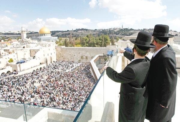 متشددان يهوديان ينظران أمس، الى حشود من المصلين اليهود عند حائط البراق، وتبدو قبة الصخرة في الصورة