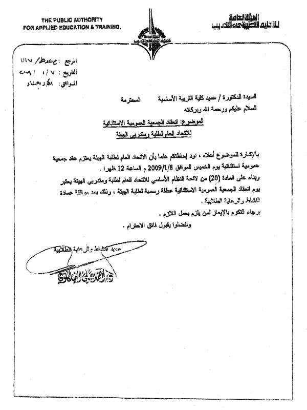 ولفت الشمري إلى أن المادة 20 من لائحة النظام الأساسي للوائح عمادة النشاط والرعاية الاجتماعية في الهيئة تنص على أن تعقد الجمعية العمومية خلال ساعات الدوام الرسمي وفي الفترة الصباحية وأن يكون يوم انعقاد الجمعية عطلة رسمية للطلبة وبعد موافقة الهيئة ممثلة بعمادة النشاط والرعاية الطلابية ويكون ابلاغ الجموع الطلابية عن الجمعية قبل انعقادها بثلاثة أيام، متسائلا «كيف لعمادة النشاط والرعاية أن ترسل خطابا رسميا لكليات ومعاهد الهيئة تطالبها بعطلة رسمية في 7 يناير (أمس) لعقد الجمعية العمومية في 8 يناير؟». وأوضح الشمري في تصريح لـ«الجريدة» أن «الخطاب وصل إلى كليات الهيئة ظهر أمس فكيف يتم إبلاغ الطلبة بأن اليوم هو إجازة رسمية؟»، مضيفا أن هناك «تخبطا وعدم التزام باللائحة وقوانين الهيئة، فكيف لعمادة النشاط والرعاية أن توافق على طلب الاتحاد بعقد الجمعية العمومية وهي تعلم ما تنص عليه اللوائح الداخلية للاتحاد؟»، مستطردا «ان كانت تعلم فتلك مصيبة وان كانت لا تعلم فالمصيبة اعظم».ولفت الشمري إلى ان «انعقاد الجمعية العمومية سيؤدي إلى تغيير جذري بالحركة الطلابية ويجب على الجموع الطلابية أن تشارك في الجمعية إن كانت شرعية ولكن للأسف لم يتقيدوا باللوائح الداخلية للنظام الأساسي للاتحاد»، مطالبا أعضاء مجلس الأمة بـ«وقف تصرفات أعضاء الاتحاد وانحياز عمادة النشاط والرعاية الطلابية للاتحاد»، مناشدا الجموع الطلابية «الوقوف مع القائمة المستقلة لنصرة الحق والاعتراض على هذه الجمعية غير الشرعية».ومن جانبه، ابدى منسق قائمه الوسط الديمقراطي في الهيئة العامة للتعليم التطبيقي والتدريب عبدالوهاب النجدي استياءه من «المسلسل الرخيص الذي يقوم به الاتحاد بخروقاته النقابية ومخالفاته العلنية لبنود اللائحة الداخلية للاتحاد وبصورة صريحة»، مضيفا «لقد تمت مخالفة عدة بنود لدعواهم بقيام جميعة عمومية يوم الخميس الموافق 8 يناير 2008 ومن تلك المواد التي تمت مخالفتها المادة رقم 18 بوجوب توجيه دعوى قبل 10 ايام من انعقاد الجمعية العمومية والمادة رقم 19 التي نص على ان يتم اعلان بيان الغرض من عقد الاجتماع ويكون ذلك قبل 3 ايام من موعد عقد الجمعية العمومية ولم يحدث ذلك ايضا وكذلك المادة رقم 10 والتي تنص على ان تعقد الجمعية العمومية الاستثنائية خلال ساعات الدوام الرسمي الصباحية ويعتبر اليوم يوم عطلة رسمية للطلبة»، وابدى استغرابه بالقول «هنالك امتحانات للطلبة في هذا اليوم فهل تؤجل الامتحانات أم تقام الجمعية في وقت الامتحان ويحرم الطلبة من المشاركة في الجمعية العمومية؟»، مؤكدا أنه في حال «مخالفة أي بند من بنود انعقاد الجمعية العمومية تعتبر الجمعية لاغية وغير صحيحة»، داعيا «العمادة للتدخل السريع ووقف هذا التلاعب الناخر في جسد العمل النقابي والديمقراطية التي يسير عليها العمل النقابي في الهيئة».