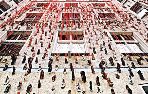 اختارت الفنانة اليابانية شيهارو شيوتا مجسمًا يتألف من مئات الأحذية التي ثبِّتت على واجهة أحد المباني وسط برلين، ضمن مشروع فنّي بعنوان «منزل المخيّلة»، تشارك فيه مجموعة من التشكيليين تُعرض أعمالهم داخل المبنى حتى 12 أكتوبر (تشرين الأول) المقبل.