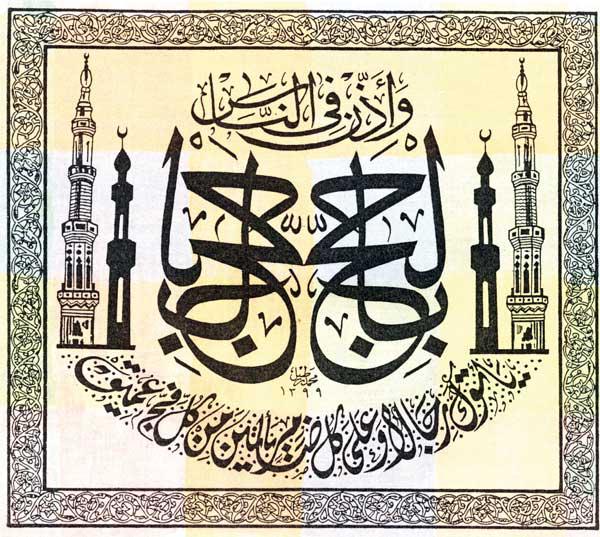 لوحة قرآنية عن الحج، حولها إطار زخرفي، مع رسم مآذن يميناً ويساراً، تعبيراً عن الآية التي بدأت بكلمة «وأذن» مع ملاحظة التأكيد على كلمة «بالحج» وكتابتها مقلوبة يساراً.