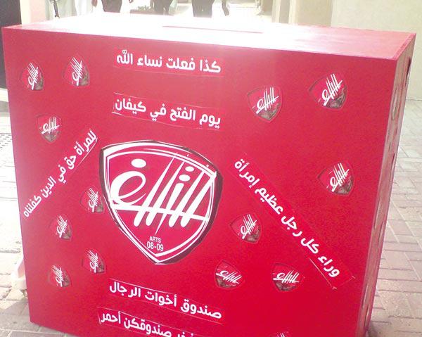 أخذت أعضاء قائمة التآلف الطلابي العزة والنشوة بالانتصار ليضعوا صندوقا احمر كبيرا مشابها للصندوق الانتخابي في جامعة الكويت كتبت عليه عبارات غريبة المعنى تذكرنا بأيام الفتوحات الإسلامية، إذ عنونته القائمة بعبارة «كذا فعلت نساء الله يوم الفتح في كيفان» وللقارئ أن يمعن جيدا ويفكر ليخرج بمعنى «نساء الله» هذا خلاف عبارة «يوم الفتح في كيفان»!
