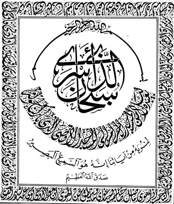 من أعمال فنان الخط العربي محمد رطيللوحة قرآنية بمناسبة ذكرى الإسراء والمعراج, بعدة أنواع من الخطوط. (البسملة) بخط الإجازة، (سبحان الذي أسرى) بخط الثلث، (بعبده ليلاً من المسجد الحرام إلى المسجد الأقصى الذي باركنا حوله) بخط جلي الديواني، (لنريه من آياتنا إنه هو السميع البصير) بخط النسخ، (صدق الله العظيم ) بخط النسخ.