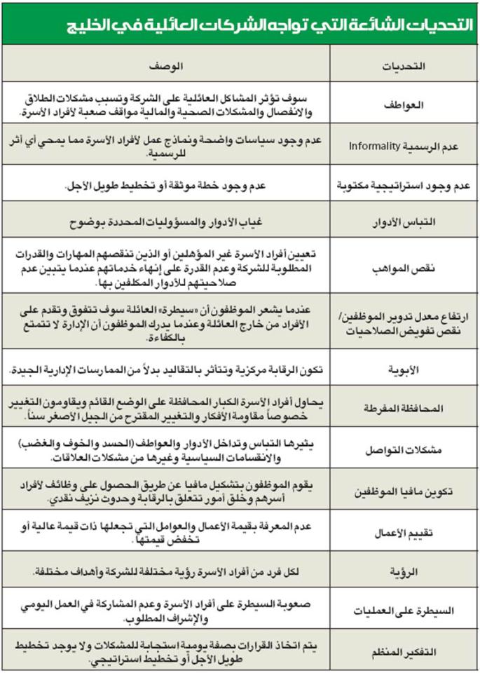 الإدراج في الأسواق المالية بالرغم من انتعاش السيولة التي فتحت قاعدة حقوق الملكية لديها فوق قدرة العائلة المؤسسة المباشرة، فإن مجموعة صغيرة من الشركات العائلية السعودية اتجهت إلى الإدراج في الأسواق المالية، لقد أظهر مسح للشركات العائلية نشرته شركة استشارات رائدة أن نسبة 20 في المئة فقط من الشركات العائلية في الشرق الأوسط لديها خطط مؤكدة للتحول إلى شركات مدرجة. إن موجة الطرح للاكتتاب الأولي العام التي ضربت المملكة العربية السعودية قبل أزمة سوقها المالية في عام 2006 يحتمل أن تكون السبب في الكثير من الصخب الأولي بشأن التحول إلى شركات مدرجة. تعمل الأجيال الشابة في منطقة الخليج التي درست في الخارج على مسايرة ما يستجد في مجال تطوير الأعمال وتتقبل الأساليب المبتكرة لزيادة الربحية وتدرك أن هناك إمكانية كبيرة في المشاركة في عمليات الطرح للاكتتاب الأولي العام. وبالنسبة الى هؤلاء يمكن الحصول على القيمة من خلال المشاركة في الطرح الأولي للاكتتاب العام أكثر من المحافظة على الوضع الحالي. مشكلة التعاقبتركز دائما الشركات العائلية بدول مجلس التعاون الخليجي، بالإضافة إلى المناطق الأخرى من العالم، على المحافظة على الوضع الراهن. من الممكن أن يسيء الغرب وبسهوله فهم مدى إشراك أعضاء العائلة في الشركات العائلية بدول مجلس التعاون الخليجي على أنه محاباة أو محسوبية. ومع ذلك، فإن هذه الممارسة بوجود أقارب والتي تمثل أغلبية في الوظائف الرئيسية تعد ممارسة مقبولة والتي تعمل على تقوية أواصر وعلاقات العائلة. ونتيجة لذلك، يكون أصحاب المصلحة من الخارج أو المستثمرين رأيا ضعيفا أو لا يكون لهم الرأي في ما يتعلق بأمور الملكية، حيث إنها تنتقل بشكل رئيسي بين الأجيال، ونتيجة لعدم الفصل بين ملكية الشركة وإدارة الشركة، فإن قضايا التعاقب تحظى بقليل من الاهتمام الرسمي وتفترض تضمينات عملية مهمة خلال التشغيل اليومي للمؤسسة. وبعد تكوين دول الخليج الحديثة، كان هناك عدد من الشركات العائلية التي تم تكوينها، امتلكت هذه الشركات العائلية مؤسسات مستمرة في العمل من خلال قادتها من الرعيل الأول الذين دخلوا الآن في سن الستينات والسبعينات أو في بعض الأحيان الثمانينات. تم تعقيد الانتقال المطلوب في تلك المنظمات عن طريق العديد من القضايا من أهمها الحجم الكلي للمجموعات العائلية في المنطقة. نصائح لوضع خطة تعاقب في ما يلي بعض النصائح لوضع خطة تعاقب: 1- بدء التخطيط مبكراً بعد أن نفهم أن الحد الزمني لانتقال السلطة والإدارة طويل جدا، يصبح السبب لبدء عملية التخطيط في مرحلة مبكرة أمراً واضحاً، كلما طالت الفترة التي تخصصها المنظمة في تطوير وإتقان خطة التعاقب كلما اصبحت عملية الانتقال سلسة.2- مشاركة العائلة في مرحلة التخطيطفي معظم الأحيان الخلافات العائلية تقوم على أمور صغيرة كعدم استشارة افراد العائلة في الأمور أو القضايا العائلية، في حقيقة الأمر فتح الحوار مع أعضاء العائلة يعد أفضل الطرق لبدء عملية خطة التعاقب. 3- لا يقتضي الأمر أن يكون لكل فرد حصص متساوية بالرغم من أن هذا يعد مفهوماً مثالياً، فإننا بحاجة الى التوافق مع حقيقة أننا لا نعيش في عالم مثالي، لا تدرك معظم المؤسسات أن الإدارة والملكية مسألتان مختلفتان في تخطيط التعاقب. 4- الحصول على مساعدة خارجية هناك العديد من المتخصصين المحترفين الذين يتمتعون بالخبرة في وضع وتطوير وتطبيق خطة تعاقب فعالة وسوف يعملون على تسهيل عملية حل المسائل العائلية وخطة التعاقب.
