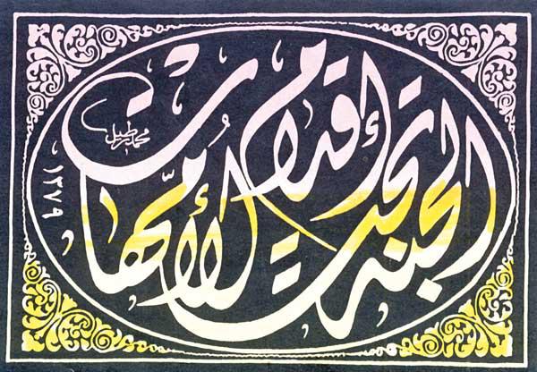 (الجنة تحت أقدام الأمهات) كُتبت بالخط الديواني على شكل بيضاوي.