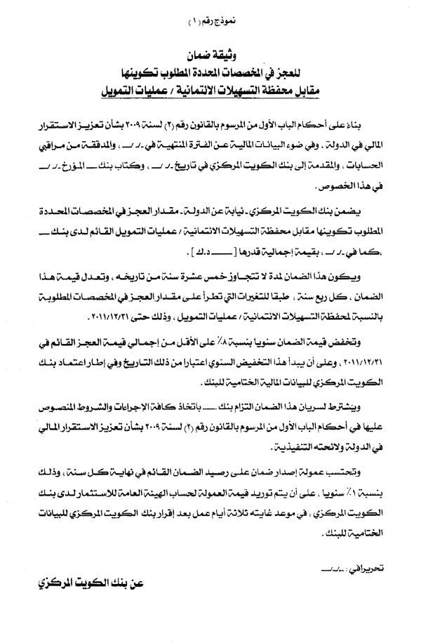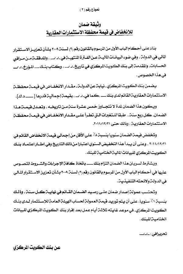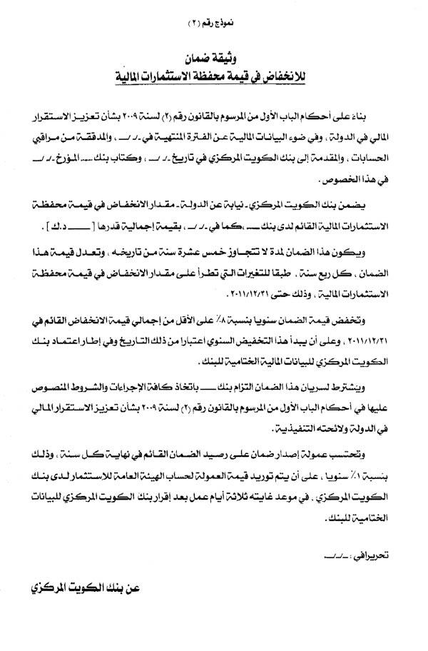 • على البنوك تحديد ضمانات العملاء والعوائد المحتجزة في الحسابات المعلقة والإيرادات المؤجلة للبنوك الإسلامية• تقييم الاستثمارات المالية بصفة ربع سنوية وفقاً لقواعد المحاسبة الدولية والأعراف المصرفية• يحدد مقدار ضمان الدولة - ربع سنوي بمقدار العجز غير المغطى بعد استخدام الارباح وأي من بنوك حقوق المساهمين• تلتزم الشركة بإدارة محفظة الأصول المقدمة منها كضمانات لجميع الديون القائمة قبل صدور المرسوم بقانون• الشركات غير المستفيدة يجوز لها إصدار سندات أو صكوك تتحول إلى أسهم ضمن زيادة رأسمالها لإطفاء الخسائر والديون• يجوز لشركات الاستثمار التي تواجه صعوبات في الوفاء بالتزاماتها التقدم بطلب قضائي للحماية من الدائنين مع اشتراط موافقة المركزي• يجب فصل أرصدة الاستثمارات المالية عن العقارية في سجلات مستقلة ويتحمل البنك أي خسائر عن بيع أي من مكونات المحفظتين• في حال عدم انتظام أي من أرصدة التمويل الجديد يلتزم البنك بتكوين مخصصات بـ50 في المئة من قيمة المخصصات المطلوبة كما يجب أن يتخذ كل الإجراءات لمتابعة العملاء غير المنتظمين• يحق للبنك إصدار سندات تتحول إلى أسهم أو أسهم ممتازة تكون أولوية الاكتتاب فيها لمساهمي البنك ثم للهيئة العامة للاستثمار• يحق للهيئات والمؤسسات الحكومية إنشاء شركات ذات أغراض خاصة لتملك الأصول الحكومية والحقوق التشغيلية لها• على البنوك وضع النظم المناسبة للرقابة الداخلية لضمان الالتزام بالشروط والقواعد المنظمة للبرنامج التمويليحصلت «الجريدة» على نص اللائحة التنفيذية للمرسوم بقانون رقم 2 لسنة 2009 بشأن تعزيز الاستقرار المالي بالدولة، والذي اقره مجلس الوزراء أمس بناء على عرض وزير المالية.وركزت اللائحة التنفيذية في الفصل الاول على ضمان العجز في مخصصات التسهيلات الائتمانية والتمويل، وضمان الانخفاض في المحفظتين الاستثماريتين، المالية والعقارية، القائمة لدى البنوك بناء على سجلات 31/12/2008، وان يتم تقييم كل من المحفظتين بناء على كل المعايير الدولية والتعليمات الصادرة من بنك الكويت المركزي. وتحدث الفصل الثاني عن اصدار الضمانات وشروطه، بأن يصدر «المركزي» وثيقة الضمان الخاصة بكل بنك، ويضع الآلية التي تطرأ على متابعة التغييرات في قيمة الضمان، ويراعي تعديل قيمة الضمان بصفة دورية كل ربع سنة، وخفض قيمة الضمان بما لا يقل عن 8% سنوياً من اجمالي الضمان القائم قي 31/12/2011. وتطرق الفصل الثالث إلى متطلبات معالجة اوضاع البنوك، فإن رأي البنك المركزي او اي من البنوك حاجة إلى زيادة رأس المال وجب على البنك المحتاج اتخاذ اجراءات هذه الزيادة فإن لم يتمكن البنك من اتمام الزيادة المطلوبة فيجوز للبنك اصدار سندات ملزمة بالتحول الى اسهم او اصدار اسهم ممتازة تكون الأولوية فيها للاكتتاب للمساهمين ويجوز للهيئة العامة للاستثمار الاكتتاب فيها. وفي ما يتعلق بالنشاط الاقتصادي ووضع ضوابط منح التمويل الجديد، قالت اللائحة التنفيذية: «ينشأ لدى بنك الكويت المركزي نظام تسجيل البيانات الخاصة بالتمويل الجديد» كما نصت اللائحة على جواز تحديد بنك الكويت المركزي لكل بنك حصة في الحد الاقصى لاجمالي التمويل البالغ قيمته 4 مليارات دينار.واوجبت اللائحة على الشركات الراغبة في الاستفادة من البرنامج التمويلي تقديم بيان بالوضع المالي للشركة، وبيان تفصيلي بالالتزامات القائمة عليها، والمشاكل والصعوبات التي تواجهها لسداد التزاماتها تجاه الغير.وعن الاجراءات القضائية لاعادة هيكلة شركات الاستثمار، اوضحت اللائحة انه يجوز لهذه الشركات التقدم مباشرة بطلب إلى رئيس الدائرة المختصة في محكمة الاستئناف لاعادة هيكلتها ومعالجة اوضاعها.واجازت اللائحة التنفيذية للهيئات والمؤسسات الحكومية انشاء شركة او اكثر ذات غرض خاص، تقتصر اغراضها على تملك اصول حكومية او الحقوق التشغيلية للاصول الحكومية، التي يجوز اصدار صكوك وتوريق وفقاً لصيغ العقود المعمول بها في الشريعة الإسلامية.وأرفق مع ال