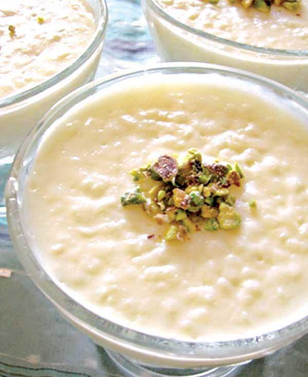 ماء ليترحليب بودرة 150 غسكّر 200 غرزّ مصري 100 غماء زهر ملعقة صغيرة الطريقة1. إغلي الماء في وعاء.2. أضيفي الحليب والسكّر وحركي جيّداً.3. أضيفي الرزّ الى الحليب واتركيه على نار خفيفة، مع التحريك المستمر.4. أضيفي ماء الزهر واستمري بالتحريك الى أن تنضج المكونات.5. زيّني الرز بالحليب بالفستق الحلبي وقدّميه بارداً.
